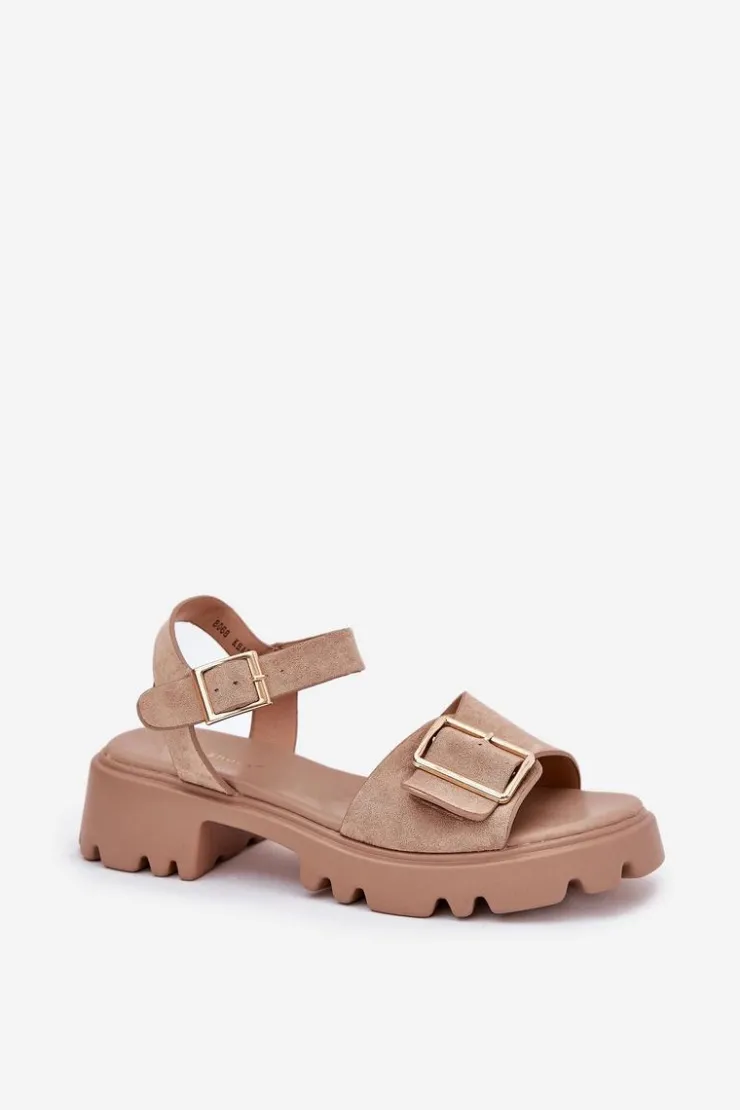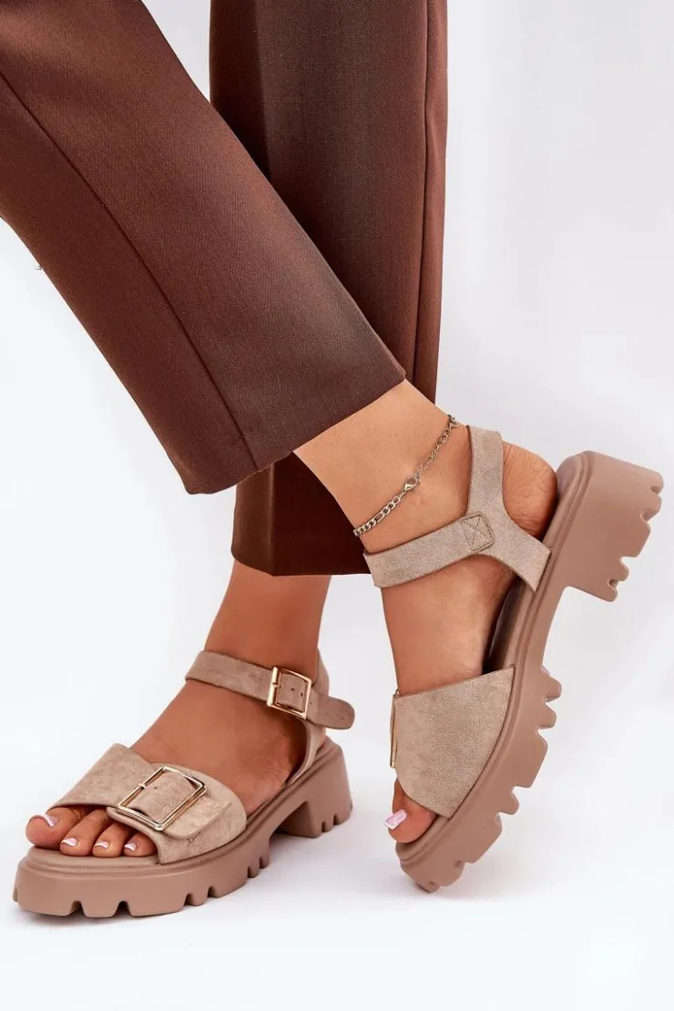 Eleganckie sandały damskie wykonane z eko zamszu, osadzone na platformie oraz płaskim obcasie, które zapewniają wygodę i stabilność. Z przodu buty ozdobione zostały dużą złotą klamrą, która dodaje im subtelnej elegancji i charakteru. Zapinane na regulowany pasek ze sprzączką, co pozwala na idealne dopasowanie do stopy. Te sandały to doskonały wybór na ciepłe dni, pasujące zarówno do sukienek, jak i spodni, łącząc styl i komfort w każdej stylizacji. Przy wyborze rozmiaru prosimy sugerować się tabelą rozmiarów.