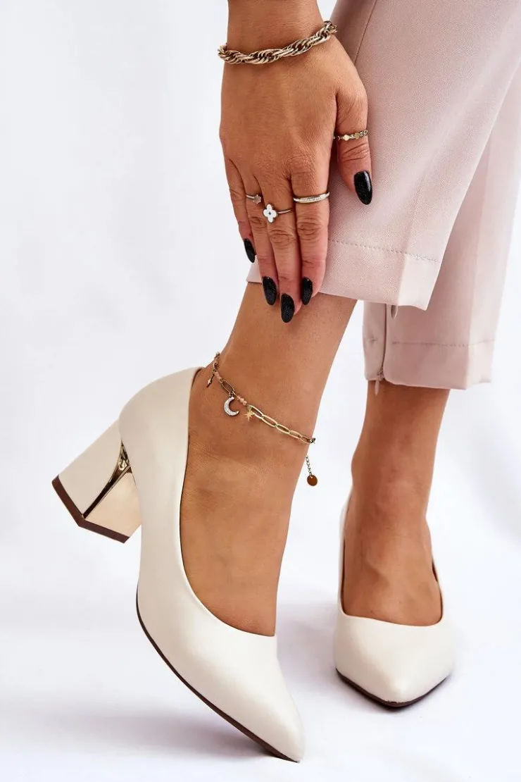 Te piękne czółenka zostały osadzone na obcasie w postaci stabilnego słupka ozdobionego lustrzanym elementem. Miękka wkładka zapewni komfortowe użytkowanie. Cholewka została wykonana ze skóry ekologicznej. Charakterystyczny nosek w szpic. Idealny model do pracy, na randkę czy biznesowe spotkania. Koniecznie musisz je mieć! Przy wyborze rozmiaru prosimy sugerować się tabelą rozmiarów.
