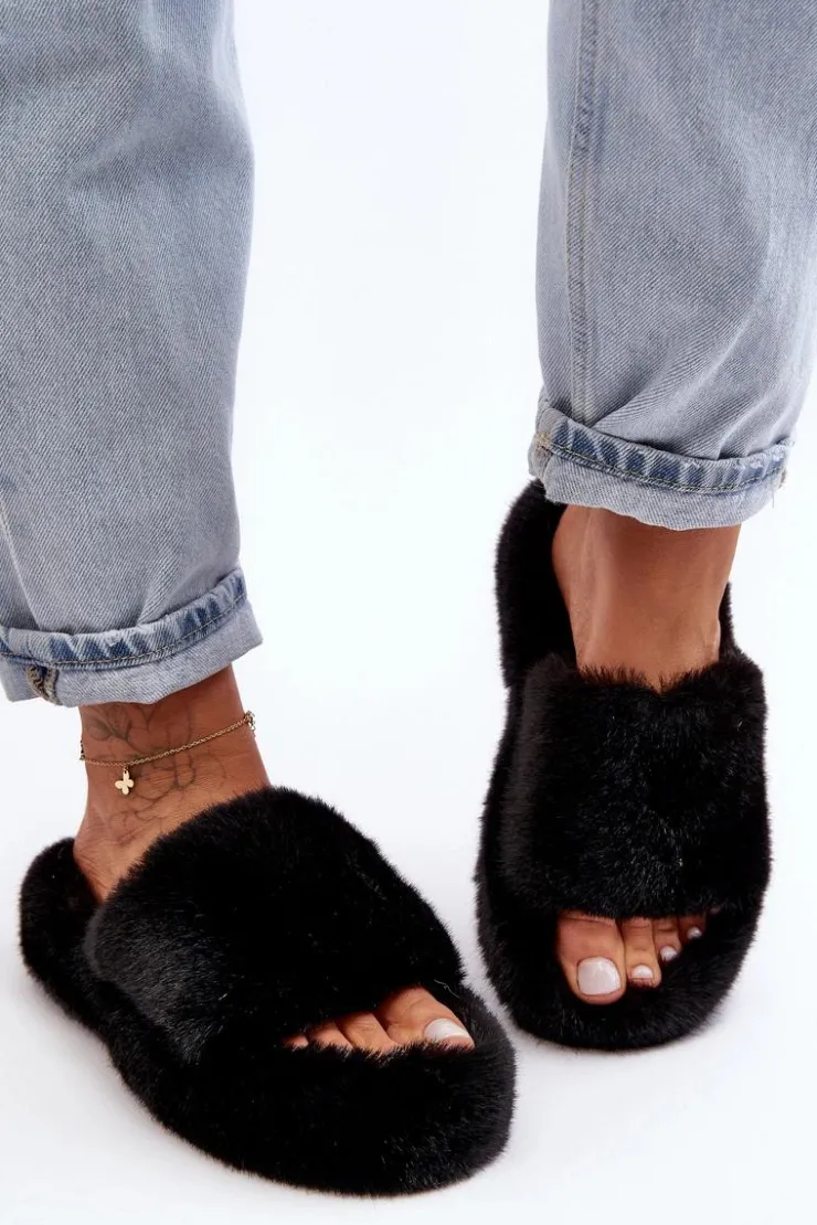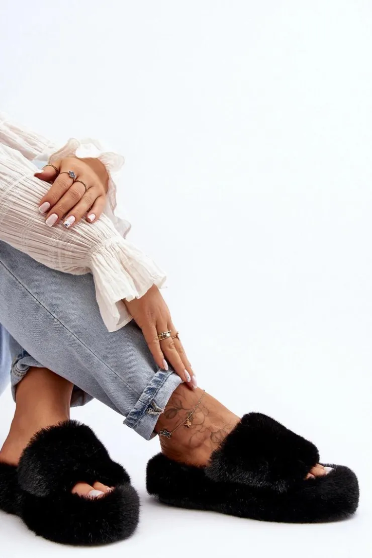 Kapcie damskie zostały wykonane z ekologicznego futerka. Model wsuwany z odkrytym noskiem i szerokim paskiem. Podeszwa wykonana z gumowego tworzywa ochroni przed zimnym podłożem. Przy wyborze rozmiaru prosimy kierować tabelą rozmiarów.