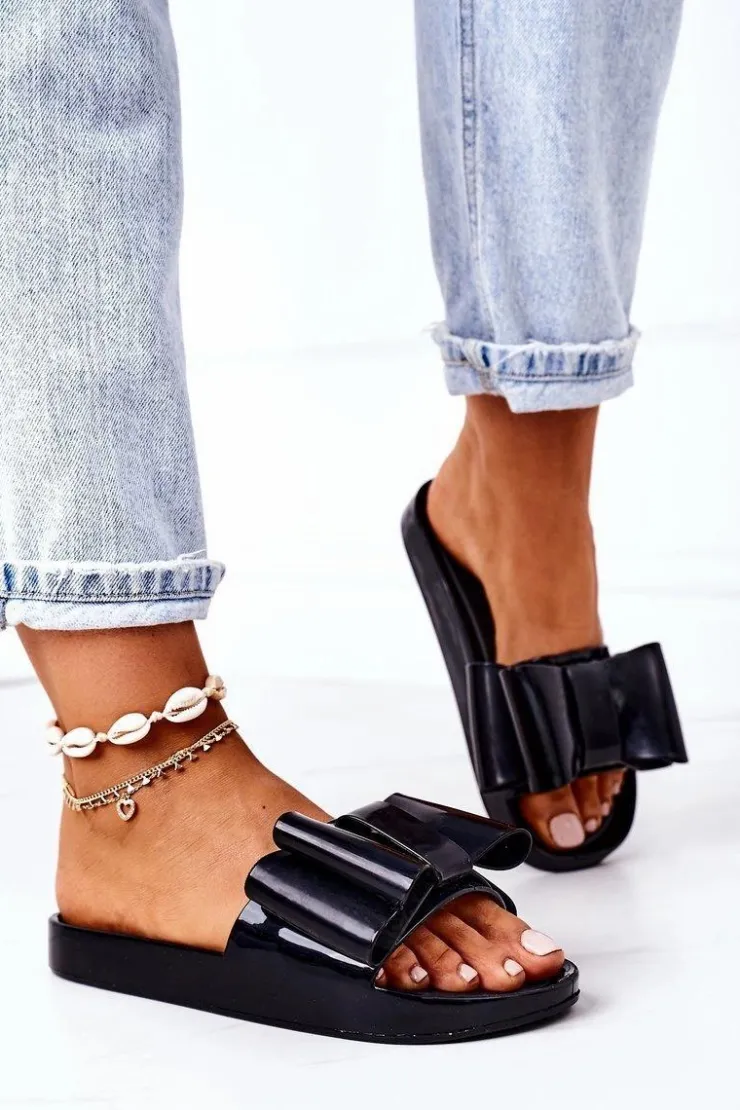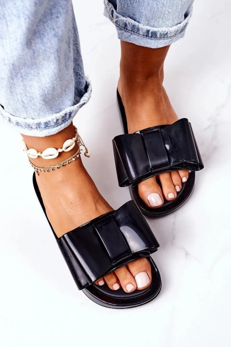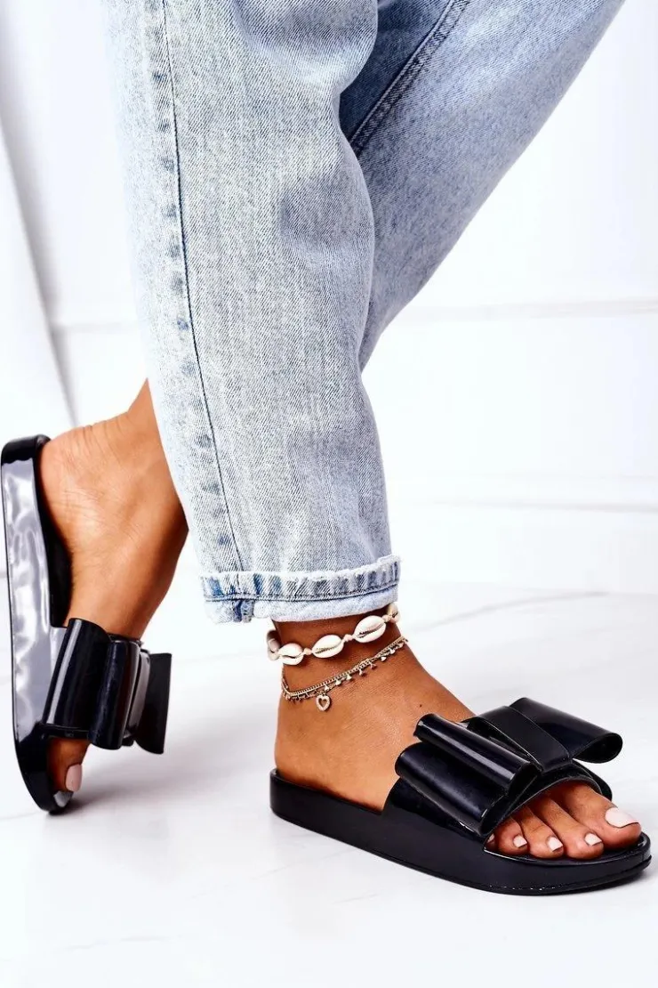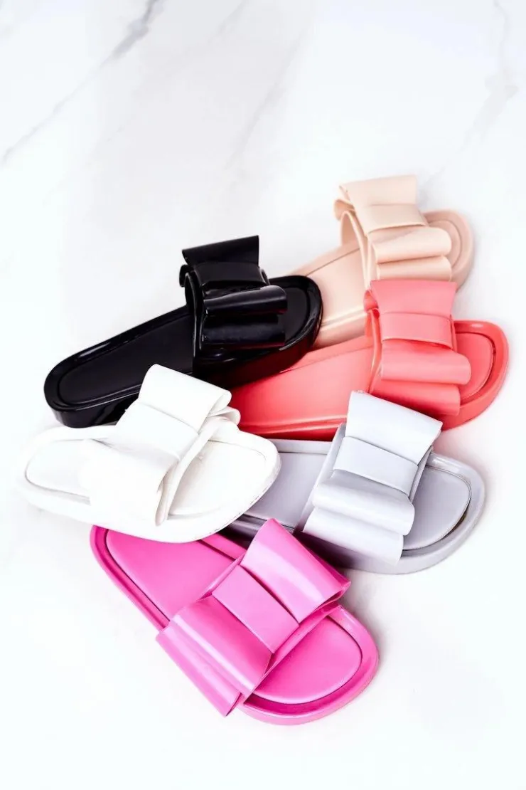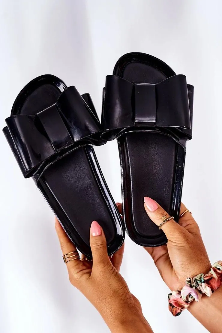 Gumowe klapki damskie z kokardą. Buty posiadają miękką wkładkę ze skóry ekologicznej. Przy wyborze rozmiaru prosimy sugerować się tabelą rozmiarów. 2 Gatunek. Na łączeniu podeszwy widoczny jest klej.