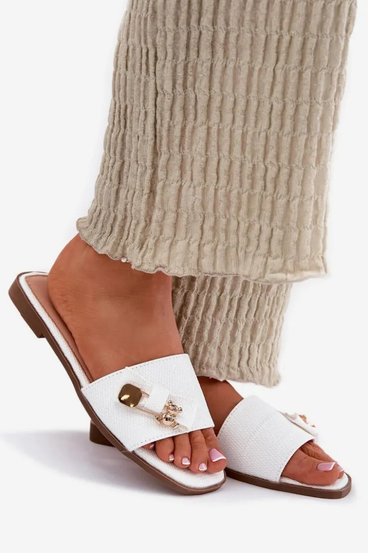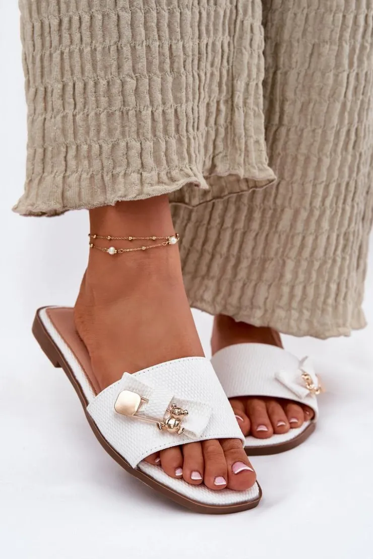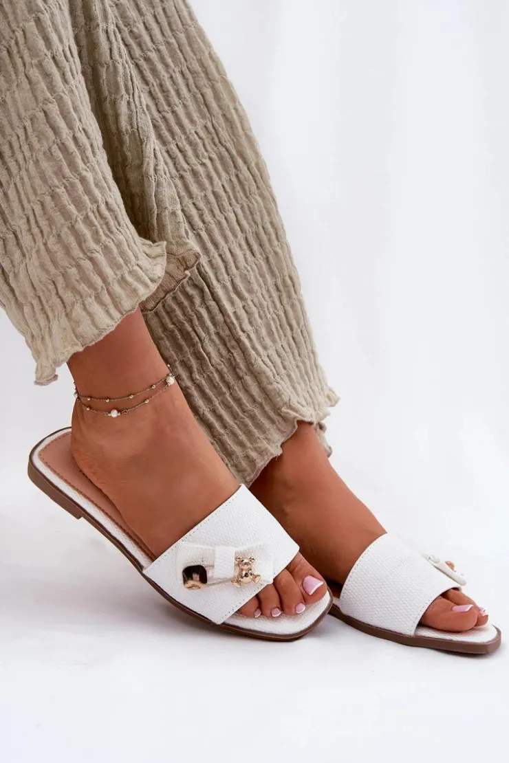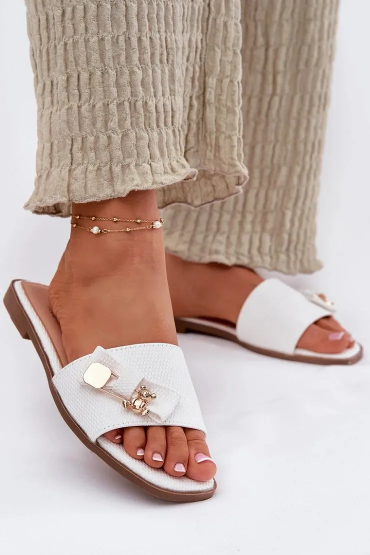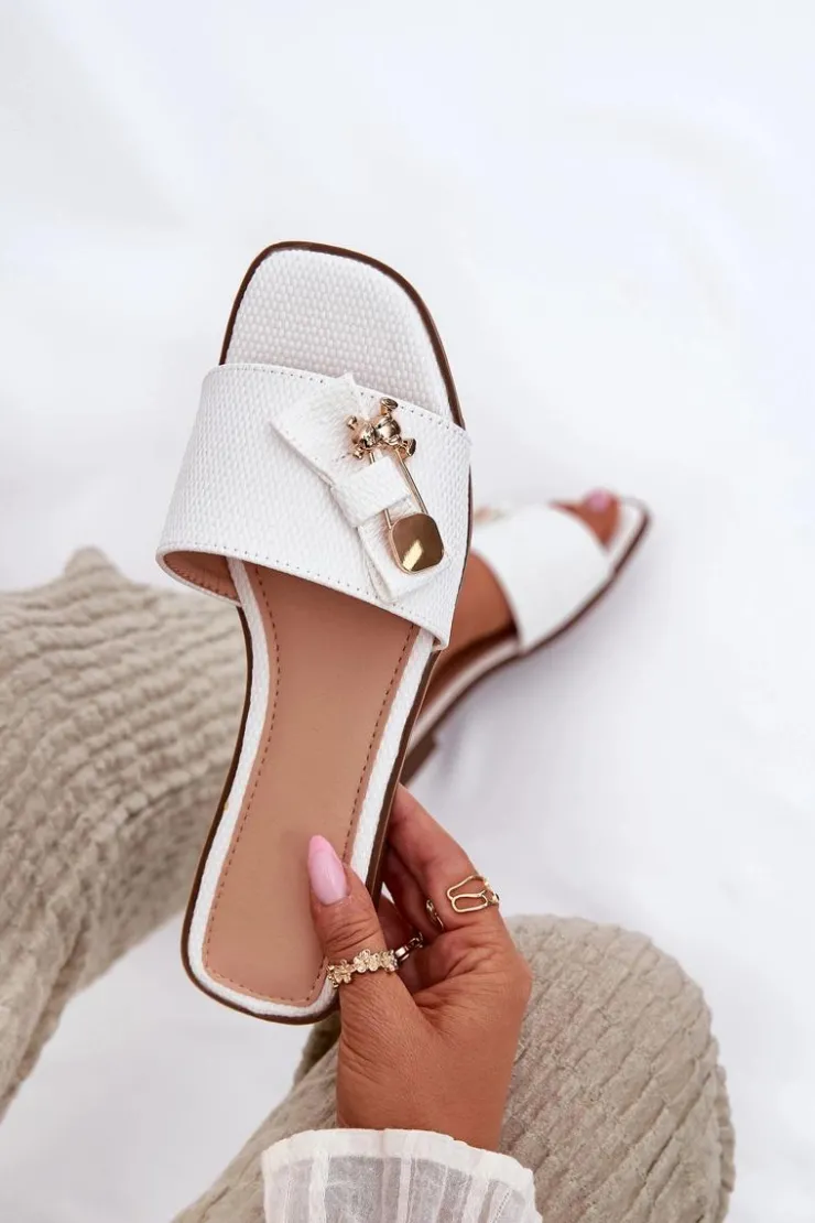 Klapki damskie na płaskim obcasie to połączenie wygody i stylu. Model ten wyróżnia się uroczą kokardką z ozdobną broszką, która dodaje stylowego akcentu. Idealne na co dzień, świetnie sprawdzą się zarówno do sukienek, jak i spodni, podkreślając kobiecy charakter każdej stylizacji. Przy wyborze rozmiaru prosimy sugerować się tabelą rozmiarów.