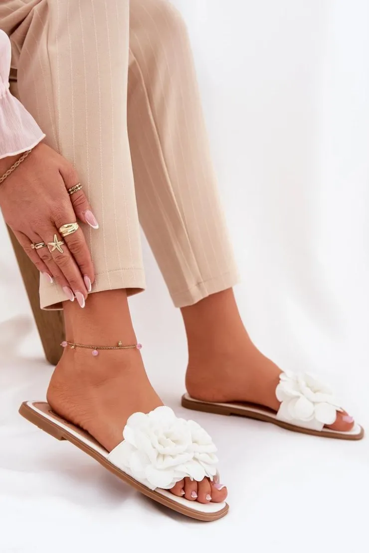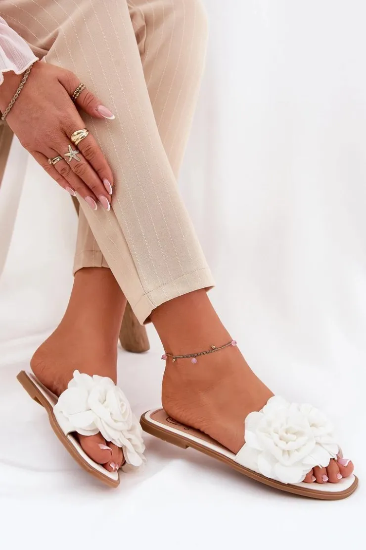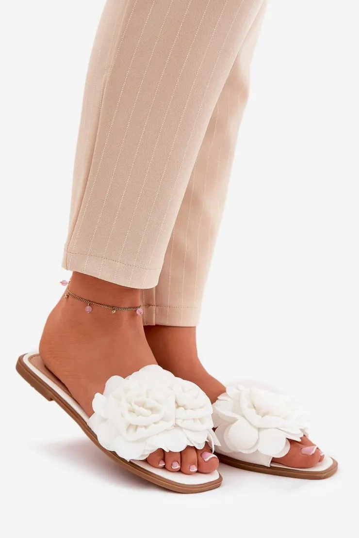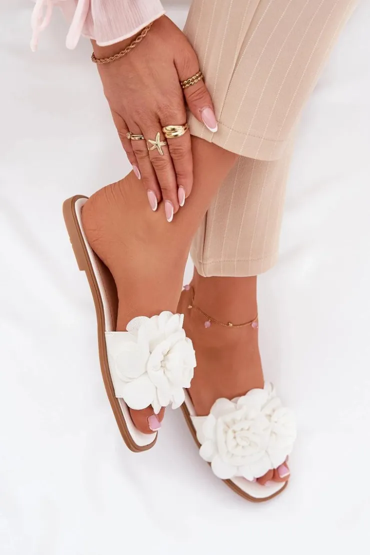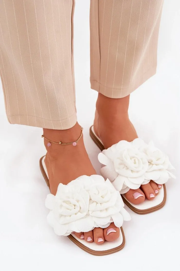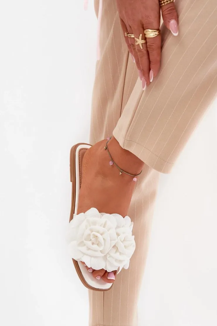 Stylowe klapki damskie wykonane z eko skóry, osadzone na płaskiej podeszwie, które łączą wygodę z delikatnym, kobiecym akcentem. Z przodu buty ozdobione są urokliwymi kwiatkami, które nadają im wyjątkowego charakteru. Idealne na ciepłe dni, te klapki doskonale komponują się z letnimi sukienkami, spódnicami czy szortami, wprowadzając do każdej stylizacji lekkość i świeżość. Przy wyborze rozmiaru prosimy sugerować się tabelą rozmiarów.