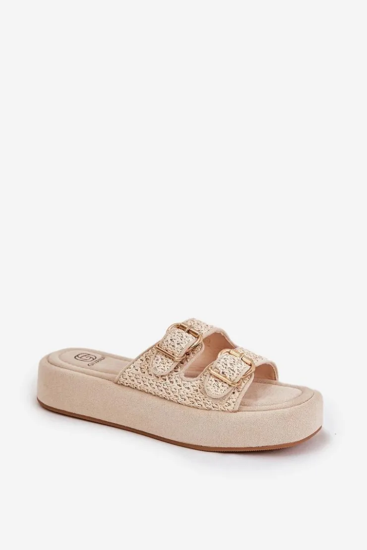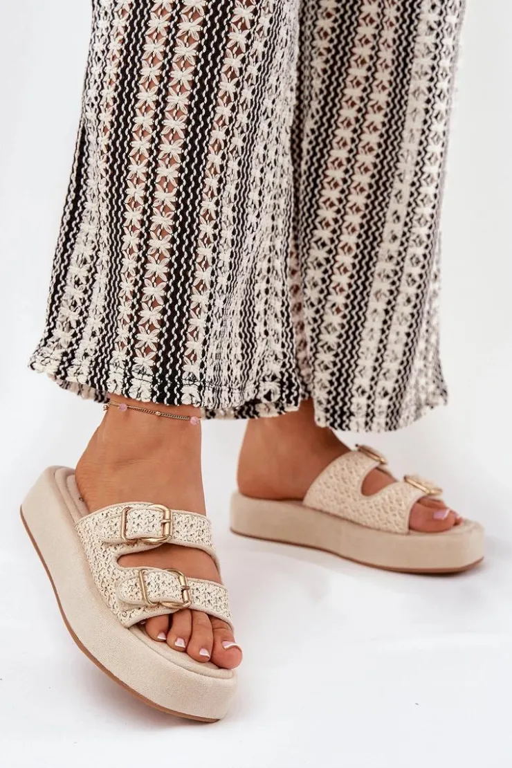Stylowe klapki damskie na platformie, które łączą wygodę z modnym wyglądem. Ozdobione plecionką i klamrami, co dodaje unikalnego charakteru. Miękka, eko zamszowa wkładka zapewnia komfort przez cały dzień. Te klapki doskonale sprawdzą się w letnich stylizacjach, pasując do sukienek, spódnic czy szortów, wprowadzając lekkość do każdej okazji. Przy wyborze rozmiaru rosimy sugerować się tabelą rozmiarów.
