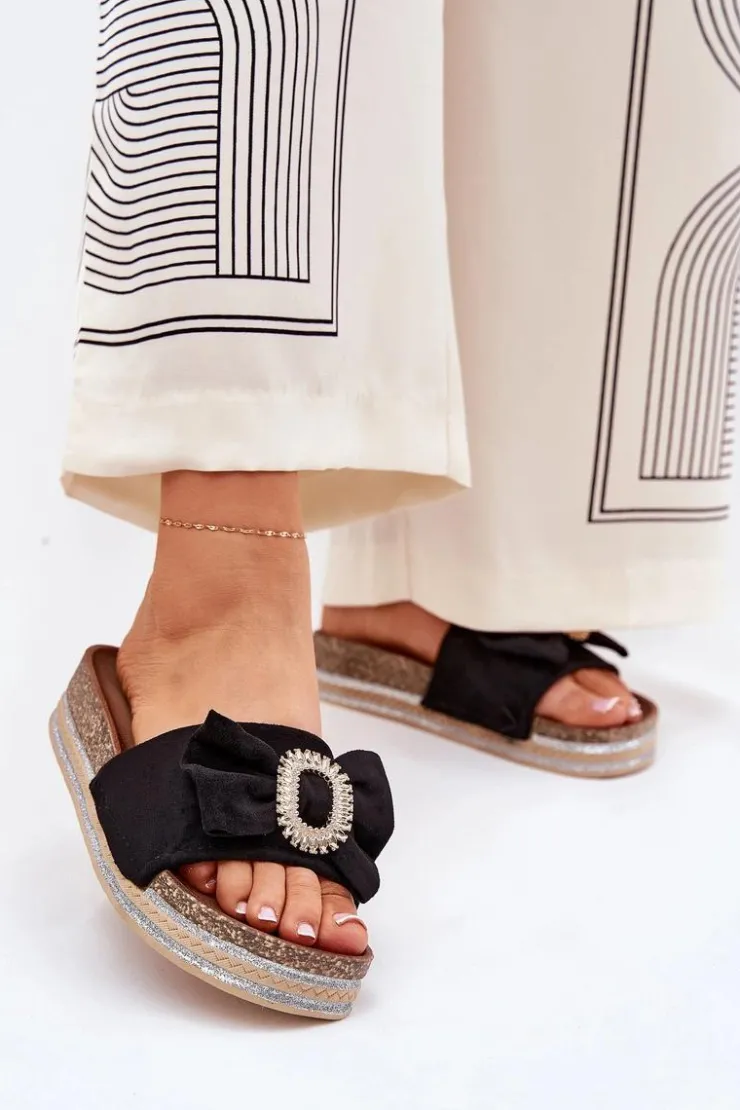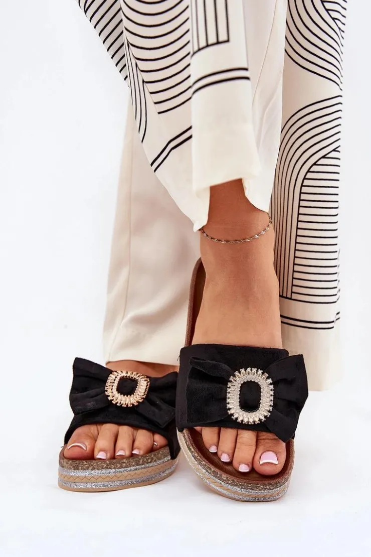 Klapki wykonane z eko zamszu. Z przodu kokardka i ozdobna broszka. Osadzone na platformie z brokatem, który wprowadza do każdej stylizacji odrobinę blasku i elegancji. Te klapki będą doskonałym wyborem na letnie dni, idealnie komponując się z sukienkami, spódnicami czy szortami, dodając każdemu lookowi nowoczesnego akcentu. Przy wyborze rozmiaru rosimy sugerować się tabelą rozmiarów.