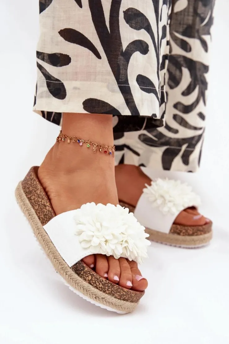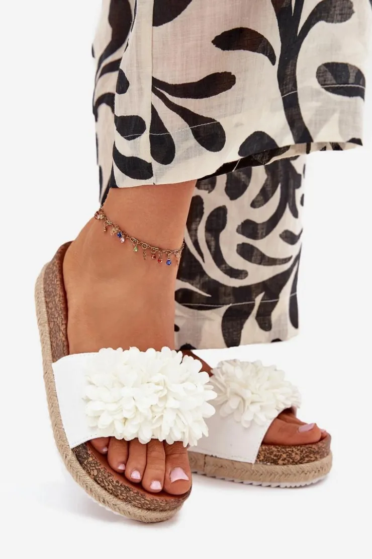 Damskie Boto Klapki Damskie Na Platformie Z Ozdobnymi Kwiatkami Białe Tessara