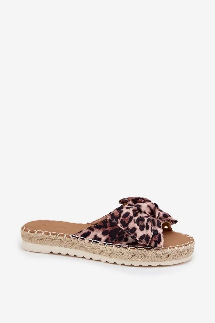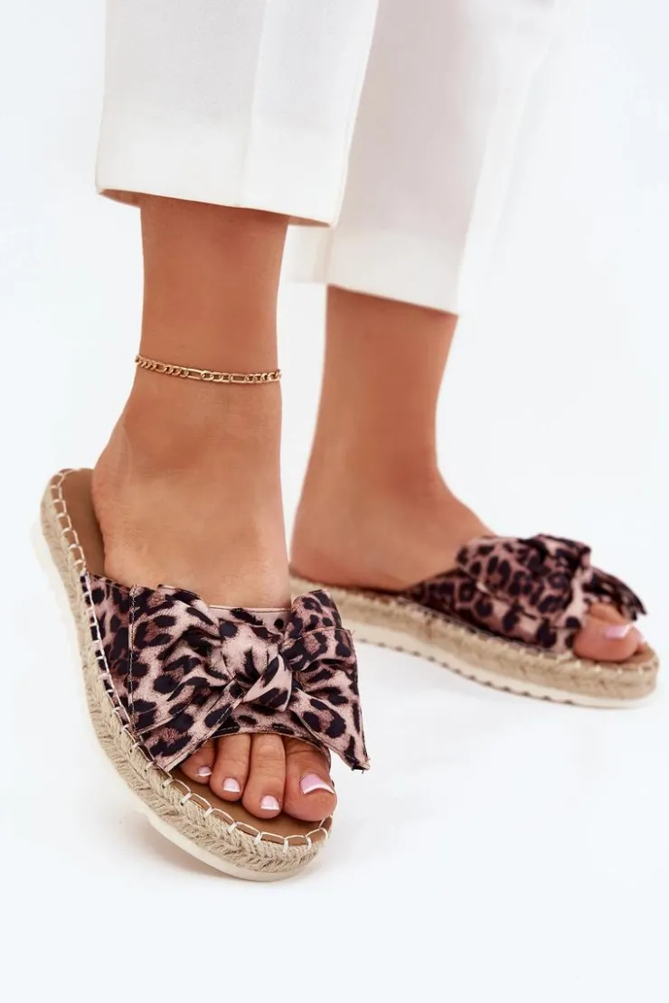 Klapki damskie wykonane z materiału tekstylnego. Osadzone na platformie z plecionką to stylowa i wygodna propozycja na ciepłe dni. Z przodu znajduje się subtelna kokardka, która dodaje im uroku. Lekkie i komfortowe, doskonale pasują do sukienek, spódnic oraz spodni. Przy wyborze rozmiaru rosimy sugerować się tabelą rozmiarów.