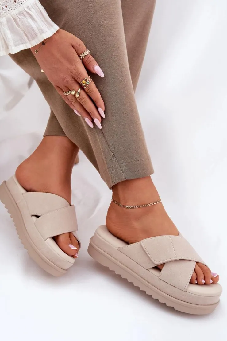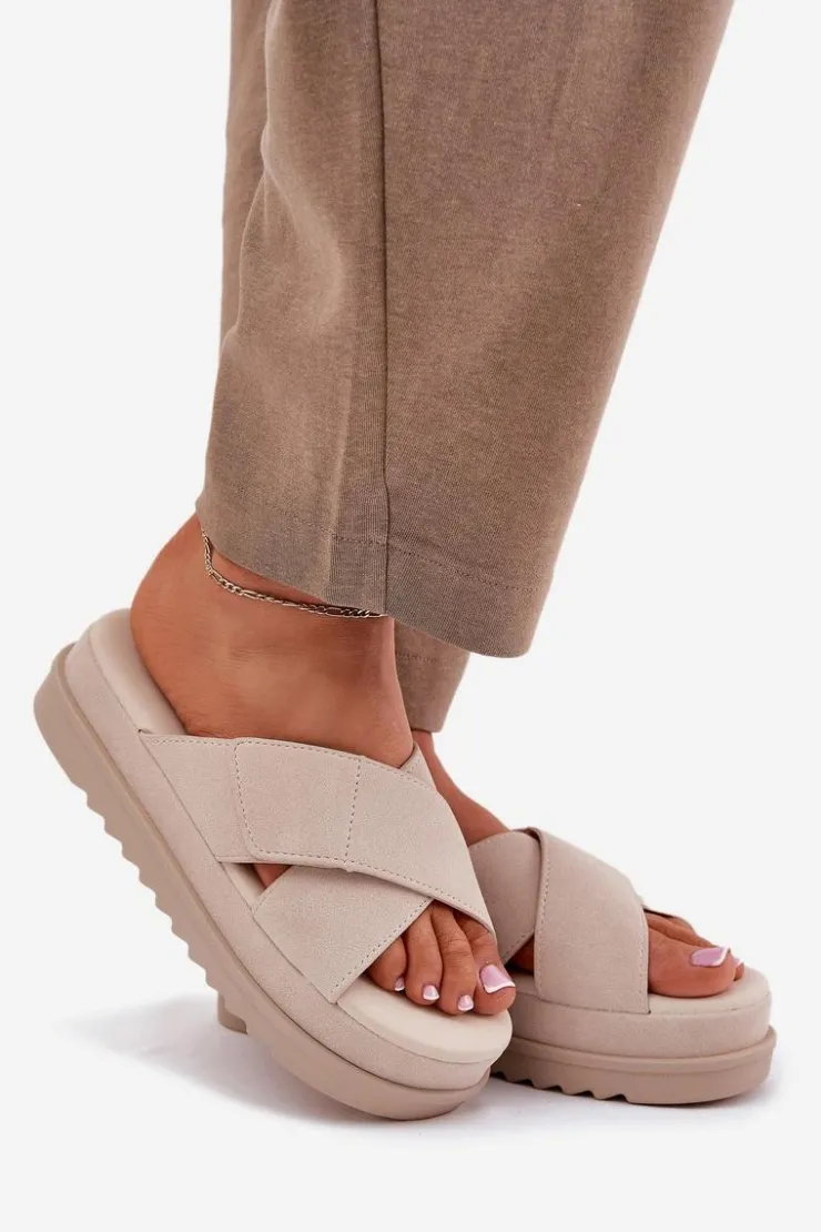Damskie klapki wykonane z eko zamszu to doskonała propozycja na ciepłe dni. Osadzone na platformie, zapewniają wygodę i stabilność przez cały dzień. Z przodu znajdują się dwa przeplatające się paski, z których jeden posiada rzep, umożliwiający łatwe dopasowanie do stopy. Te klapki to połączenie komfortu z modnym wyglądem, idealne do letnich stylizacji. Przy wyborze rozmiaru prosimy sugerować się tabelą rozmiarów.