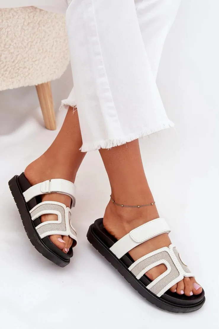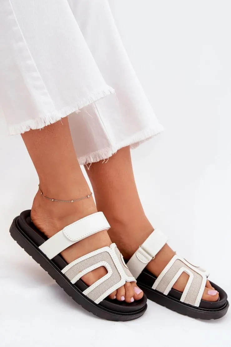 Klapki damskie wykonane z połączenia eko skóry i materiału tekstylnego. Osadzone na platformie. Pasek z rzepem umożliwia łatwe dopasowanie do stopy, gwarantując komfort przez cały dzień. Doskonałe na letnie dni, świetnie komponują się z casualowymi stylizacjami. Przy wyborze rozmiaru prosimy sugerować się tabelą rozmiarów.