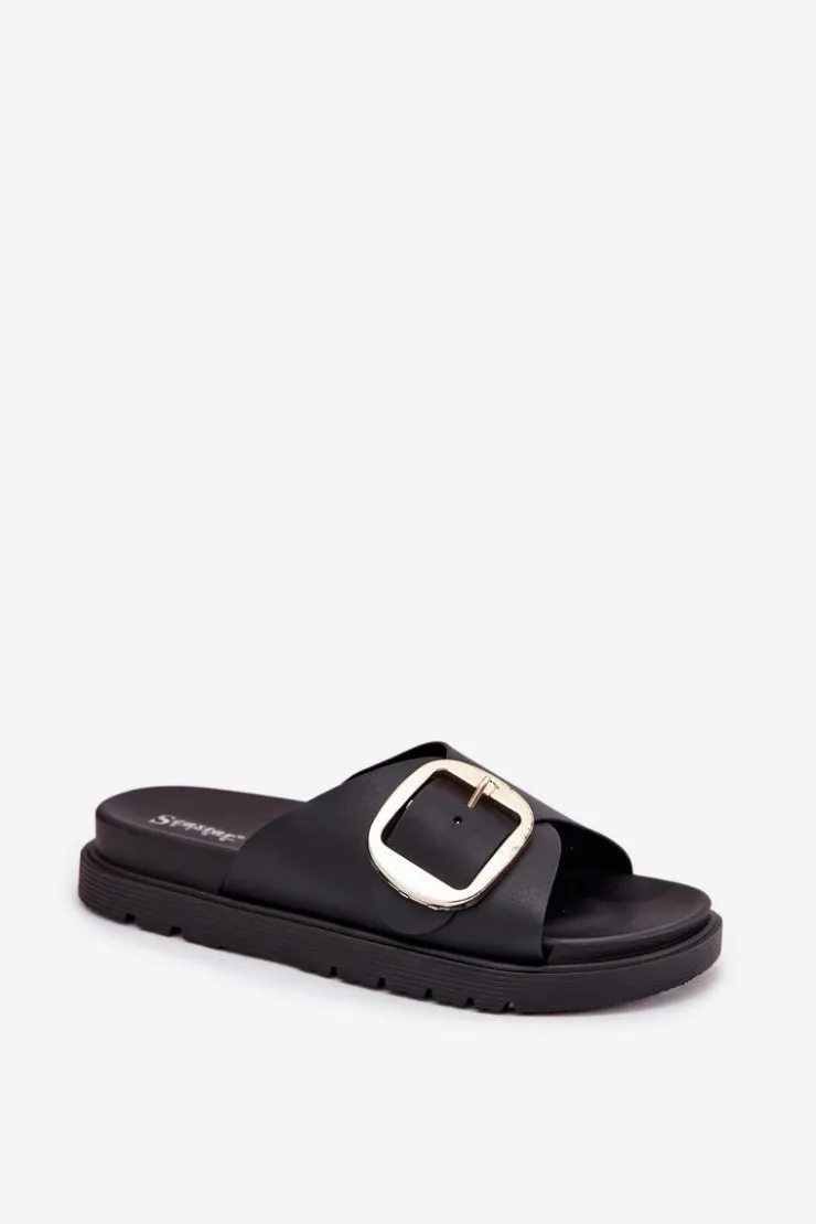 Klapki damskie wykonane z gumowego tworzywa. Osadzone na platformie. Duża złota klamra dodaje im elegancji i wyróżnia je spośród innych modeli. Idealne na co dzień, doskonale komponują się z letnimi stylizacjami, zapewniając wygodę i modny wygląd. Przy wyborze rozmiaru rosimy sugerować się tabelą rozmiarów.