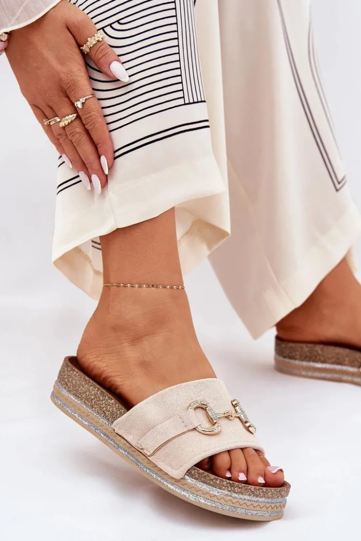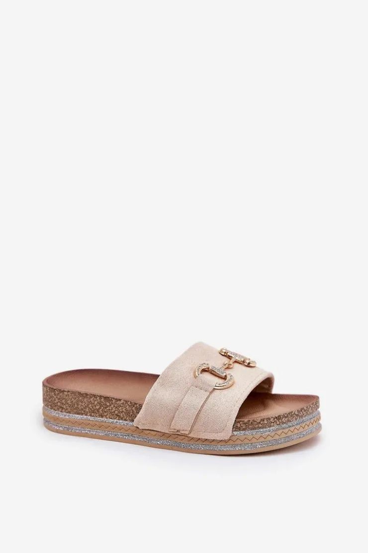 Klapki wykonane z eko zamszu. Z przodu ozdobny złoty detal, który nadaje im subtelnego blasku. Osadzone na platformie ozdobionej brokatem, które wprowadzają odrobinę glamour do każdej stylizacji. Profilowana wkładka zapewnia wygodę przez cały dzień. Idealne na letnie dni, te klapki doskonale pasują do sukienek, spódnic czy spodni, łącząc modny wygląd z funkcjonalnością. Przy wyborze rozmiaru rosimy sugerować się tabelą rozmiarów.