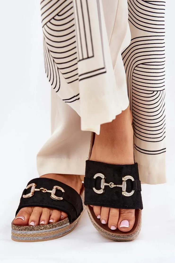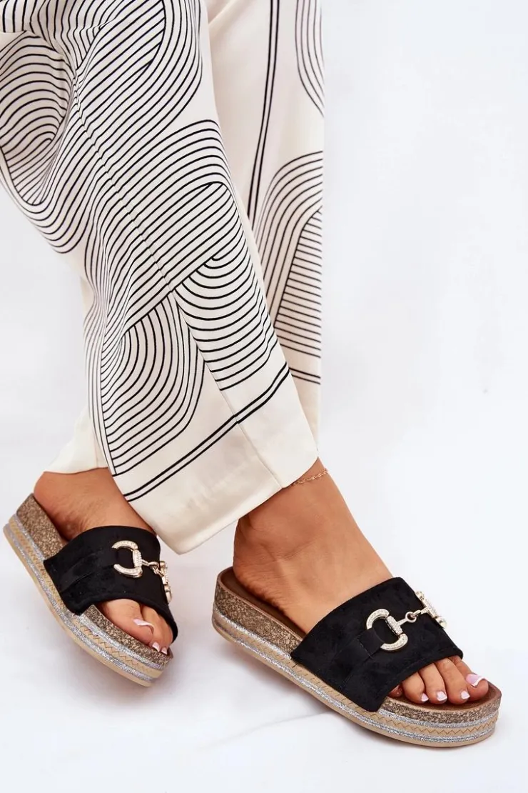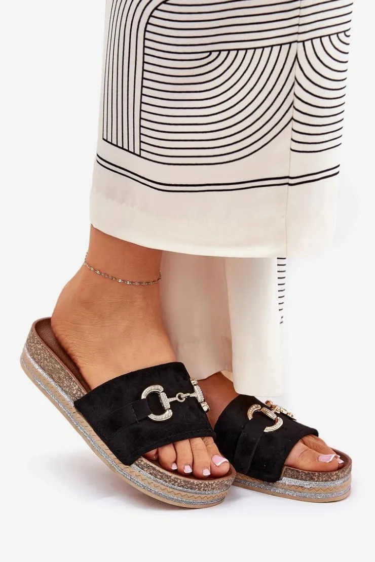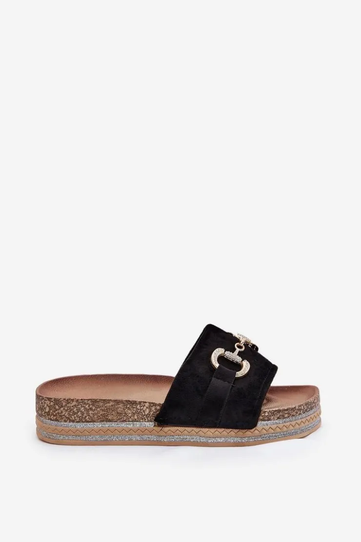 Klapki wykonane z eko zamszu. Z przodu ozdobny złoty detal, który nadaje im subtelnego blasku. Osadzone na platformie ozdobionej brokatem, które wprowadzają odrobinę glamour do każdej stylizacji. Profilowana wkładka zapewnia wygodę przez cały dzień. Idealne na letnie dni, te klapki doskonale pasują do sukienek, spódnic czy spodni, łącząc modny wygląd z funkcjonalnością. Przy wyborze rozmiaru rosimy sugerować się tabelą rozmiarów.