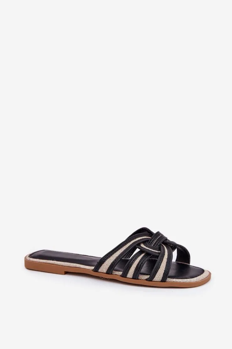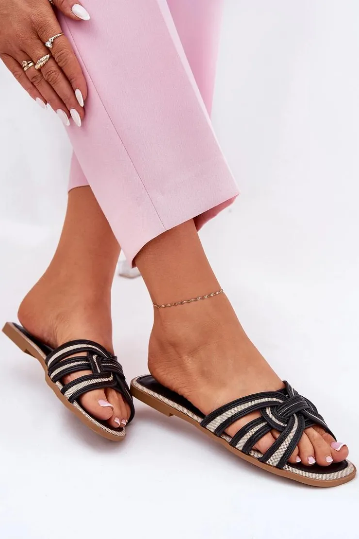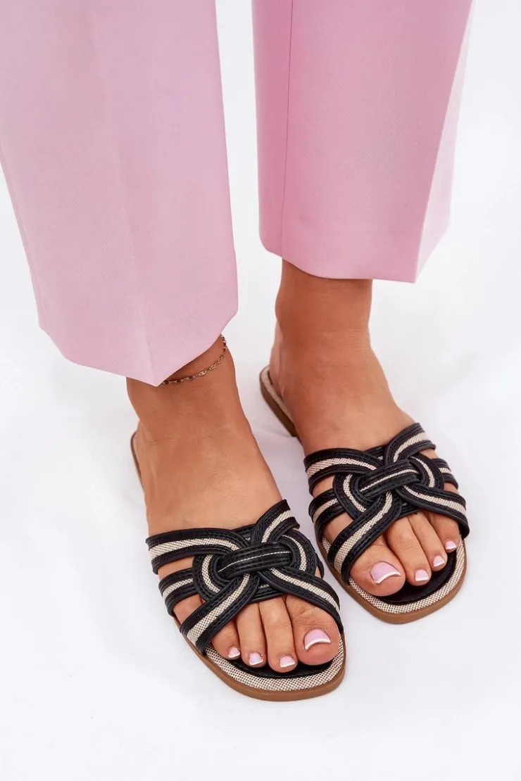 Klasyczne, płaskie klapki damskie wykonane z połączenia eko skóry i materiału tekstylnego, które łączą wygodę z subtelnym stylem. Przeplatające się paski z przodu nadają im lekkiego, nowoczesnego charakteru. Idealne do wielu letnich stylizacji, te klapki będą pasować zarówno do sukienek, jak i spodni czy szortów. Przy wyborze rozmiaru prosimy sugerować się tabelą rozmiarów.