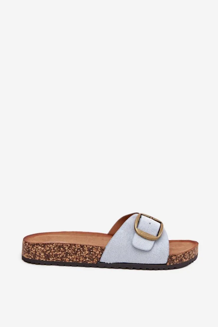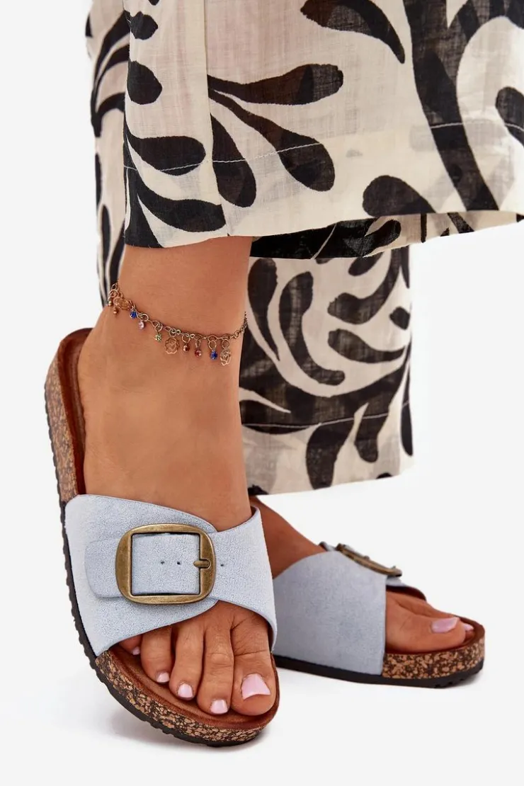 Klapki damskie wykonane z eko zamszu. Osadzone na korkowej platformie. Wyróżniają się klamrą z regulowanym paskiem, który umożliwia idealne dopasowanie do stopy. Profilowana wkładka zapewnia komfort przez cały dzień, a ich prosty wygląd sprawia, że są doskonałe do codziennych stylizacji. Idealne na letnie dni, pasują do sukienek, spódnic czy spodni, wprowadzając lekkość i styl do każdej kreacji. Przy wyborze rozmiaru rosimy sugerować się tabelą rozmiarów.