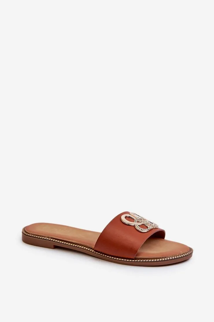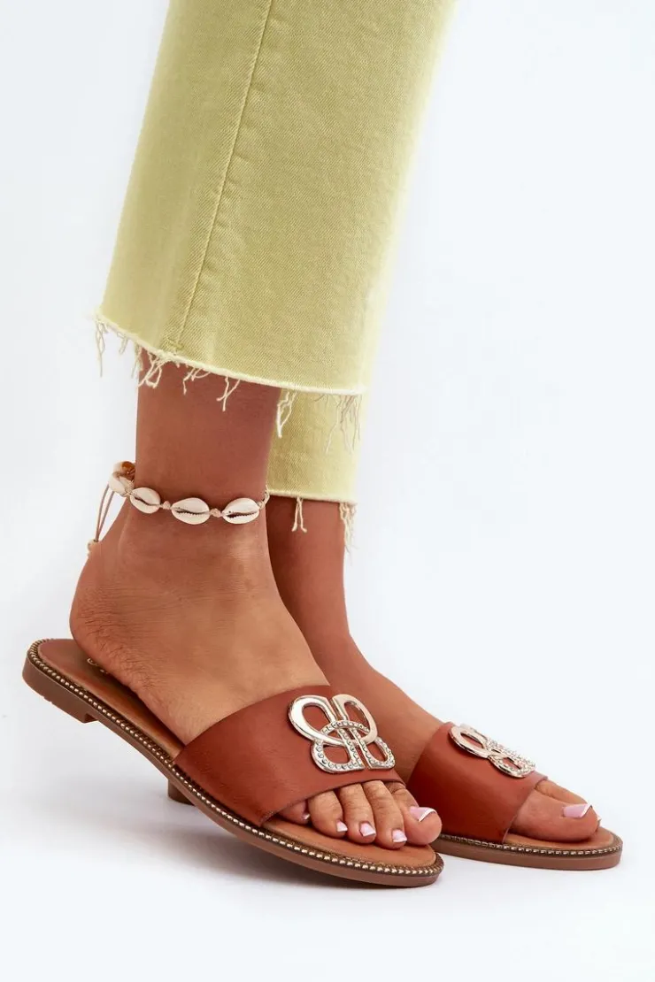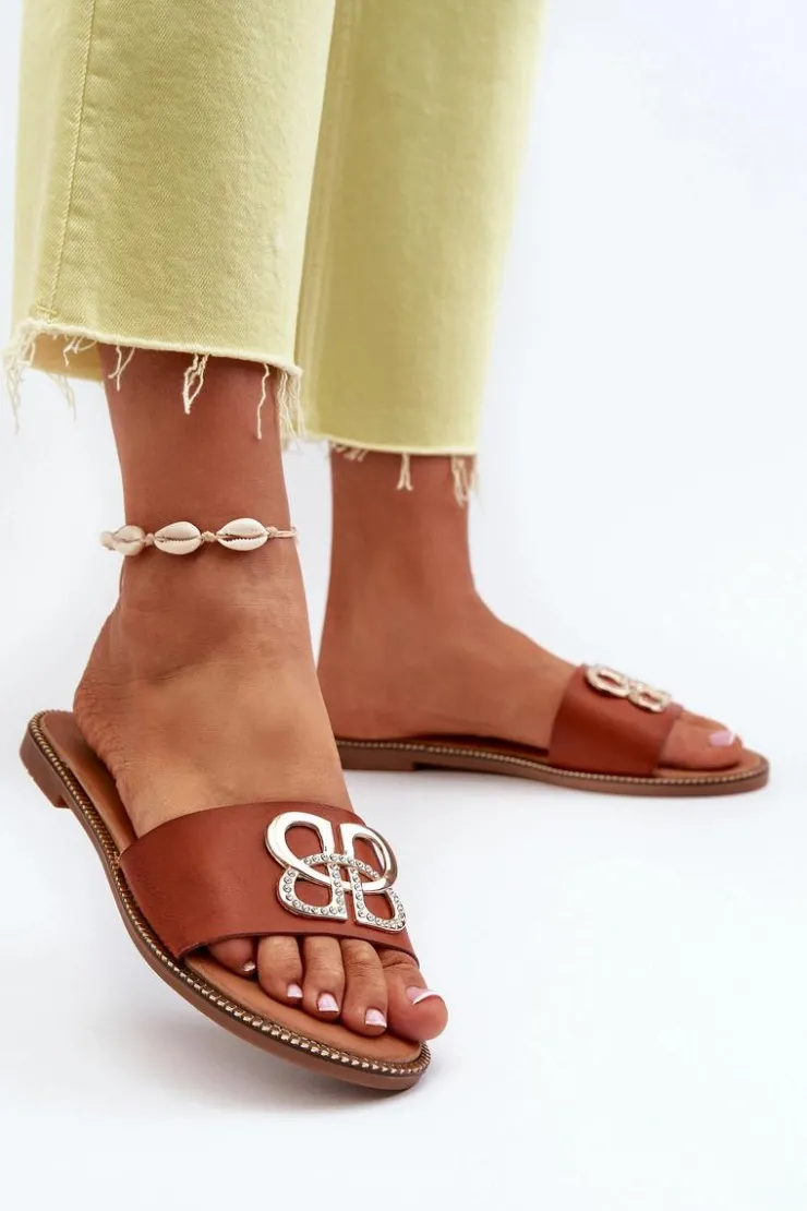 Damskie Boto Klapki Damskie Z Ozdobą Eko Skórzane Na Płaskim Obcasie Brązowe Sadria