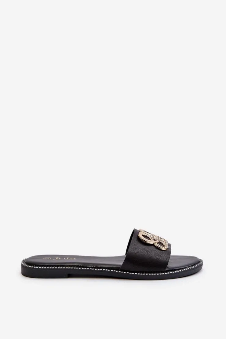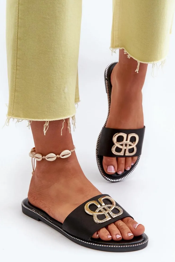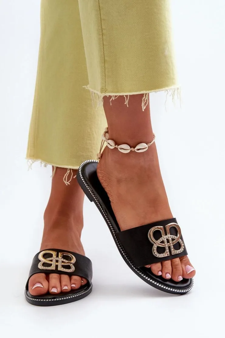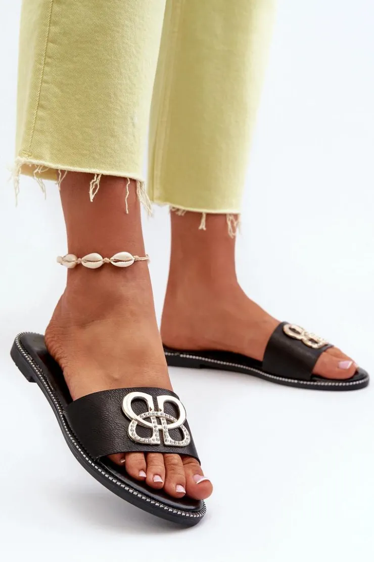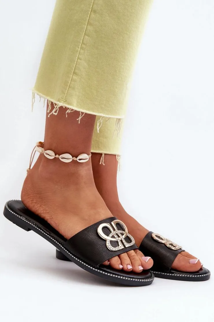 Damskie Boto Klapki Damskie Z Ozdobą Eko Skórzane Na Płaskim Obcasie Czarne Sadria