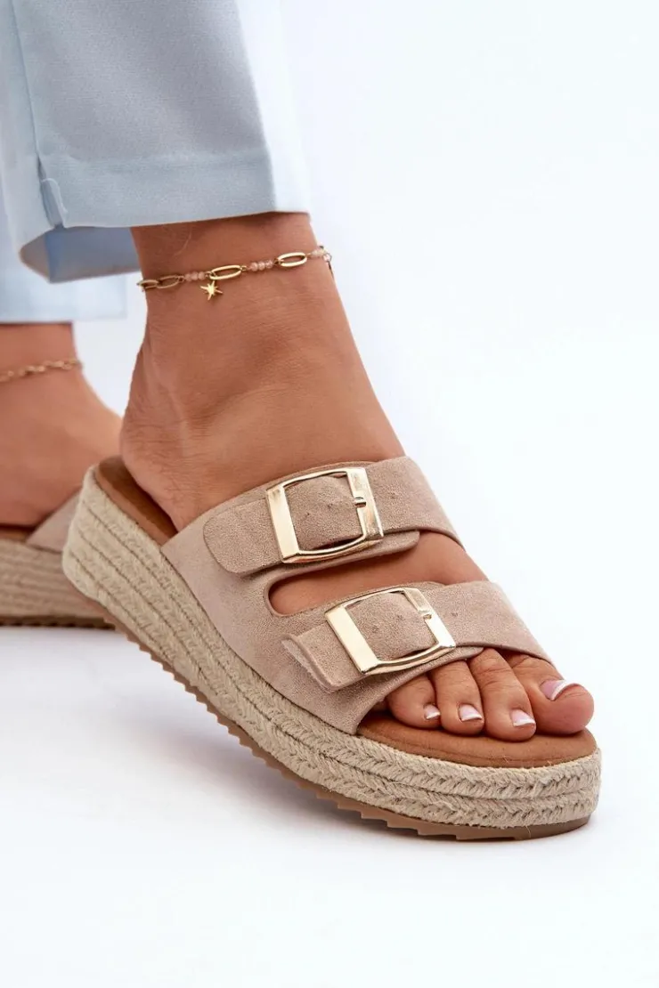 Damskie klapki wykonane z eko zamszu. Osadzone na platformie i lekkim koturnie. Z przodu dwa regulowane paski z klamrami, które zapewniają idealne dopasowanie. Model ten nie tylko prezentuje się świetnie, ale także zapewnia komfort noszenia na co dzień. Przy wyborze rozmiaru prosimy sugerować się tabelą rozmiarów.