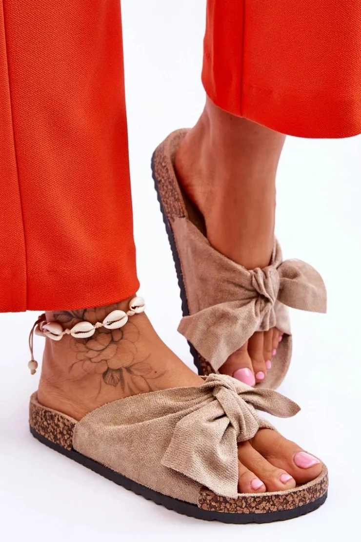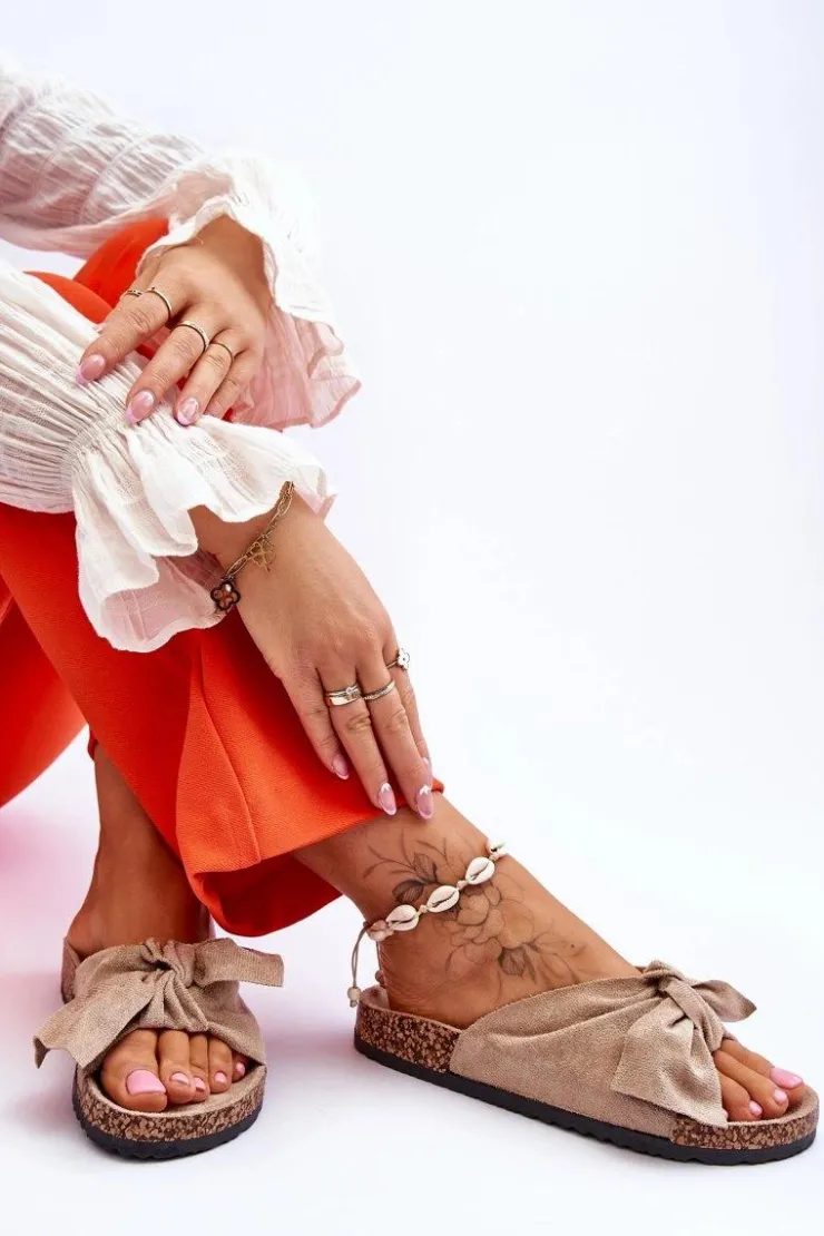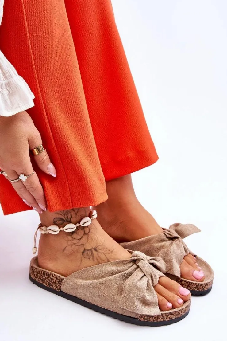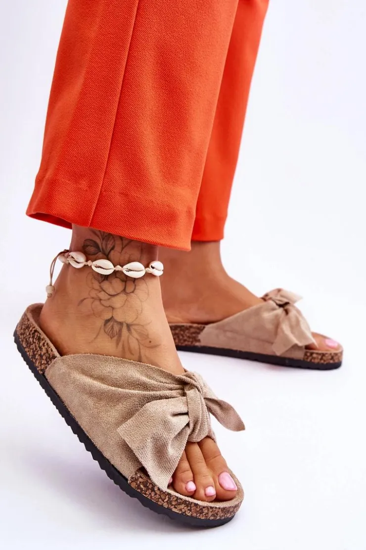 Piękne klapki na korkowej podeszwie. Buty posiadają profilowaną wkładkę, która zagwarantuje maksimum komfortu. Cholewka wykonana jest z miękkiego eko zamszu przyjemnego w dotyku. Podeszwa wykonana z tworzywa sztucznego. Urocza kokarda na przodzie. Klapki sprawdzą się zarówno na co dzień do pracy czy na zakupy, ale także do domu zamiast papci. Idealne na lato! Klapki dostępne są w wielu pięknych kolorach! Przy wyborze rozmiaru prosimy sugerować się tabelą rozmiarów.