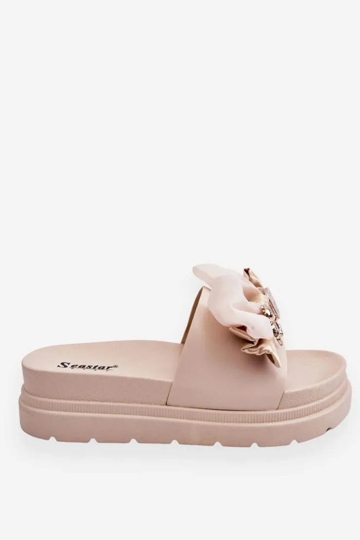 Cudowne, damskie klapki wykonane z eko skóry. Model ten posiada materiałową kokardę i imitację agrafki z misiem i blaszką z napisem. Osadzone na masywnej platformie. Wkładka została wykonana z tworzywa sztucznego. Idealne klapki na nadchodzący sezon! Koniecznie powinnaś je mieć! Przy wyborze rozmiaru prosimy sugerować się tabelą rozmiarów.