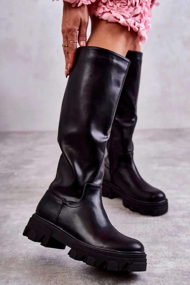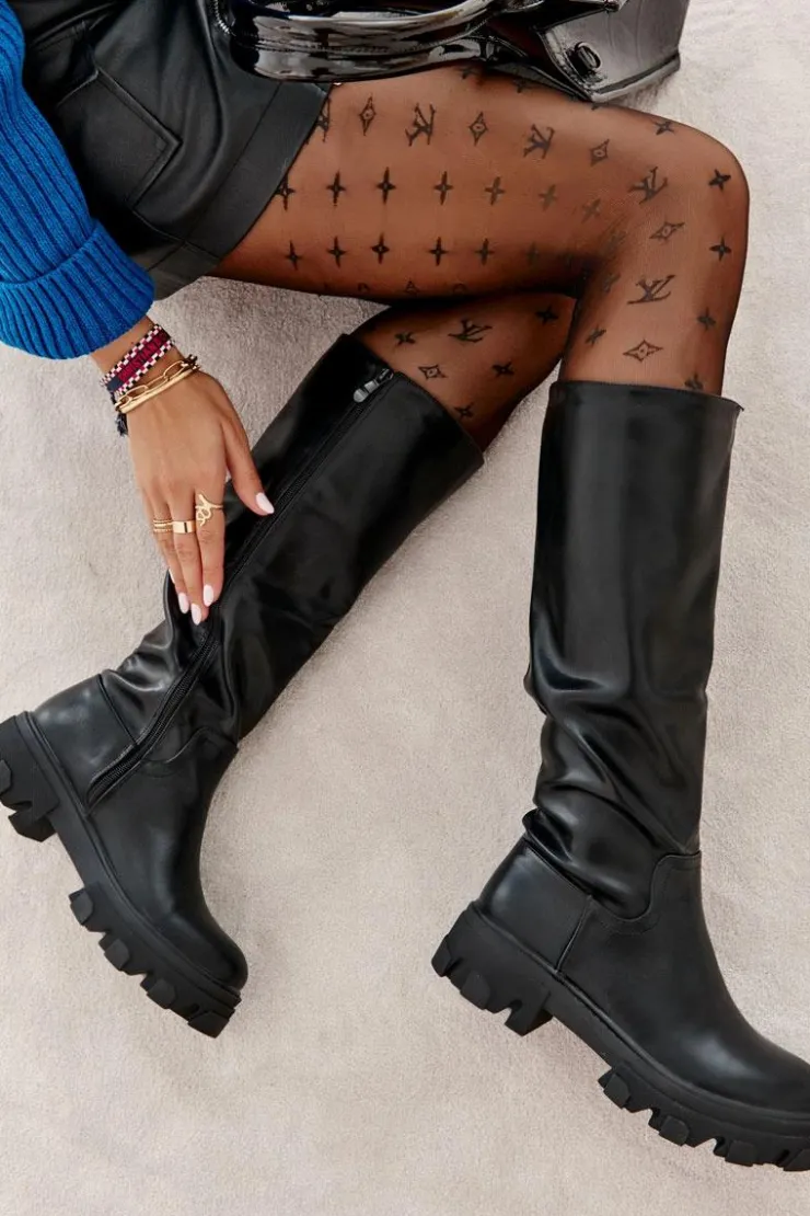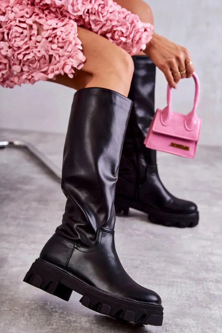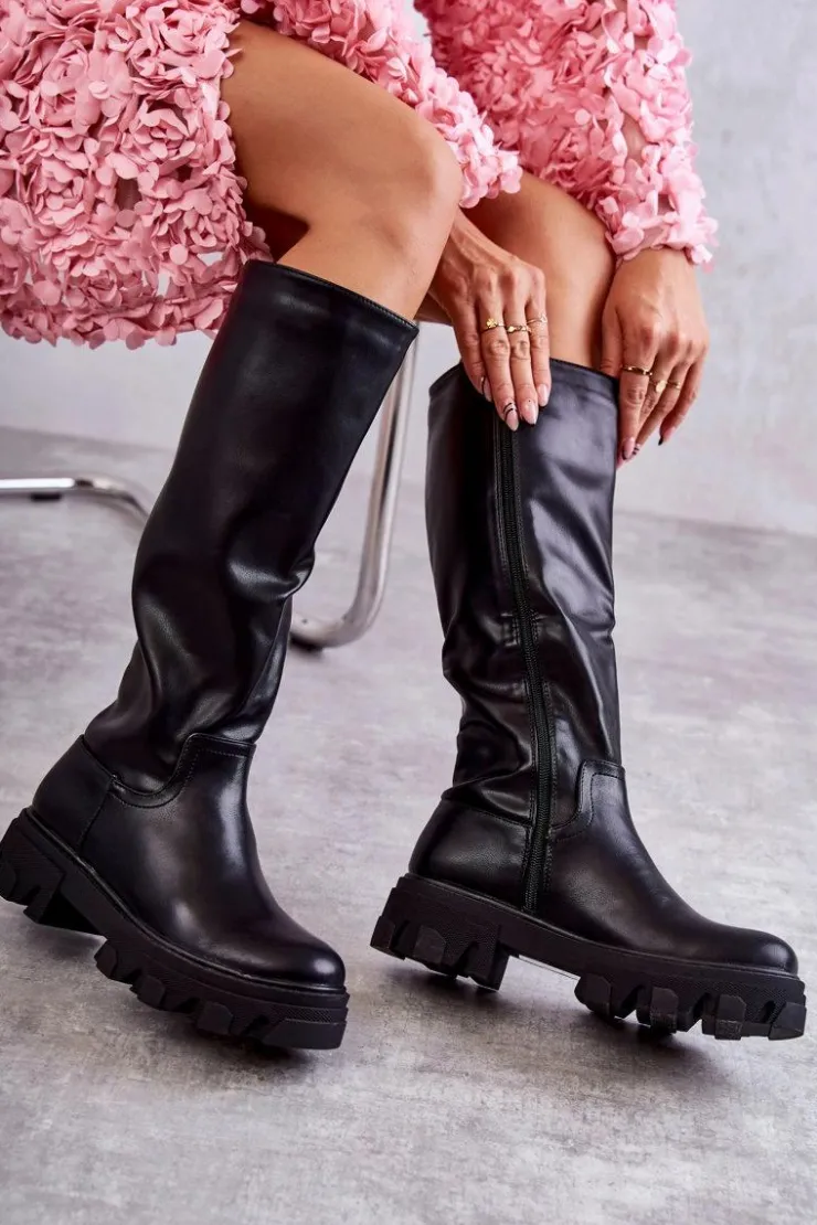 Klasyczne damskie kozaki osadzone na płaskim obcasie i platformie. Zostały wykonane z miękkiej eko skóry. Cholewka do kolana z suwakiem na całej długości. Nosek zaokrąglony. Buty te posiadają usztywniany zapiętek. Model ze żłobieniami po bokach podeszwy. Te kozaki powinny być Twoje! Świetnie będą prezentować się z sukienkami lub spódniczkami mini. Przy wyborze rozmiaru prosimy kierować tabelą rozmiarów.