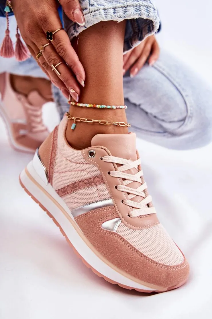 Buty sportowe osadzone na płaskiej podeszwie z delikatnym koturnem. Z tyłu podeszwa została udekorowana lustrzanym elementem. Miękka cholewka do kostki została wykonana z połączenia przewiewnego materiału, eko zamszu oraz eko skóry. Wewnątrz buta znajduje się komfortowa, piankowa wkładka pokryta tkaniną. Model wiązany na płaskie sznurowadła, co pozwala na idealne dopasowania buta do tęgości nogi. Ten sportowy fason świetnie będzie prezentować się z jeansami lub joggerami. Przy wyborze rozmiaru prosimy kierować tabelą rozmiarów.