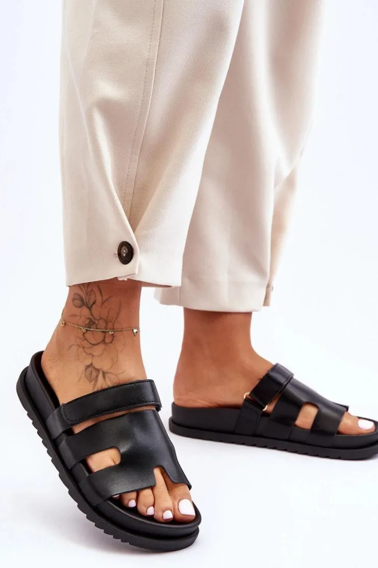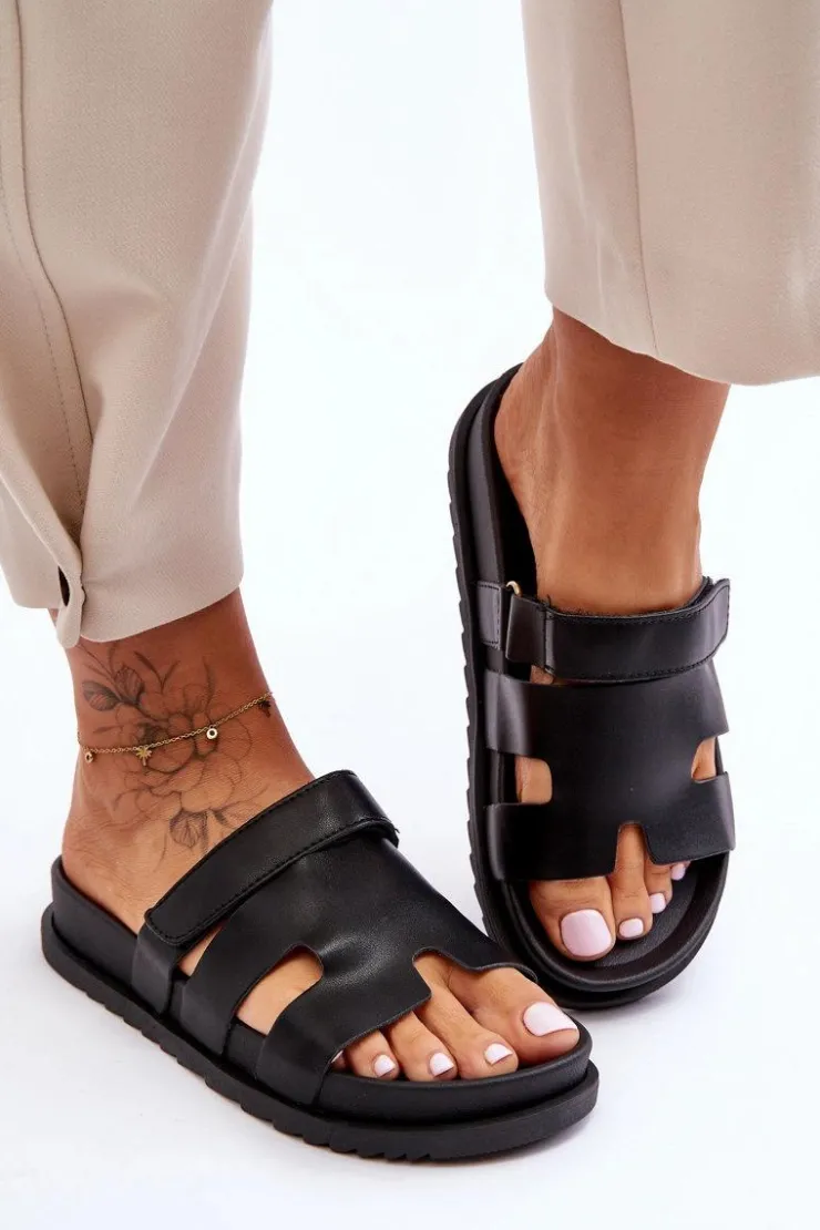 Klasyczne klapki damskie na lekkiej platformie zostały wzbogacone zapięciem na rzep, dzięki któremu obuwie można dopasować do tęgości nogi. Dobrze wyprofilowana wkładka zapewni komfort podczas użytkowania. Klapki te o ciekawym fasonie z pewnością sprawdzą się w wielu stylizacjach! Zostały wykonane z eko skóry. Przy wyborze rozmiaru prosimy sugerować się tabelą rozmiarów.