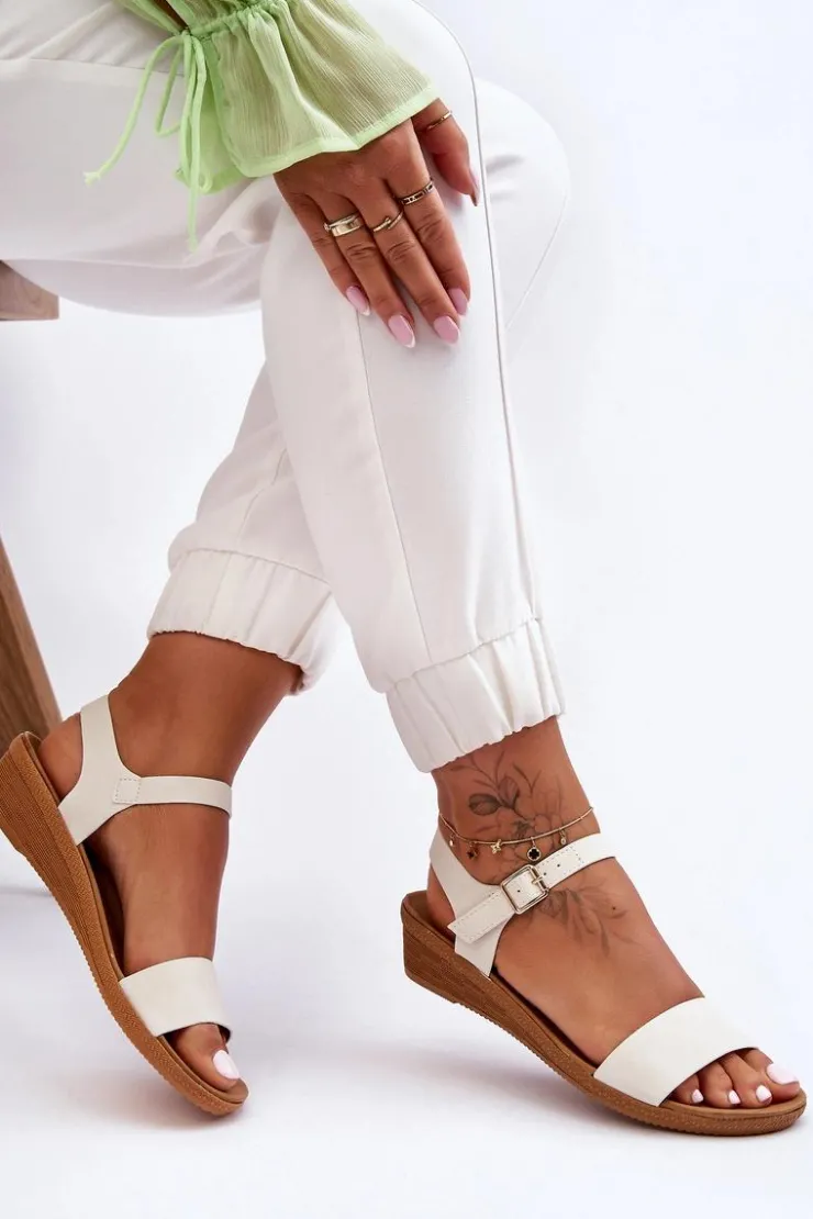 Sandałki damskie osadzono na niskim koturnie i delikatnej platformie. Model ten został wykonany z eko skóry. Wygodna wkładka zapewni komfortowe użytkowanie obuwia. Model jest zapinany na regulowany pasek ze sprzączką. Ten model idealnie sprawdzi się na upalne dni! Przy wyborze rozmiaru prosimy kierować się tabelą rozmiarów.