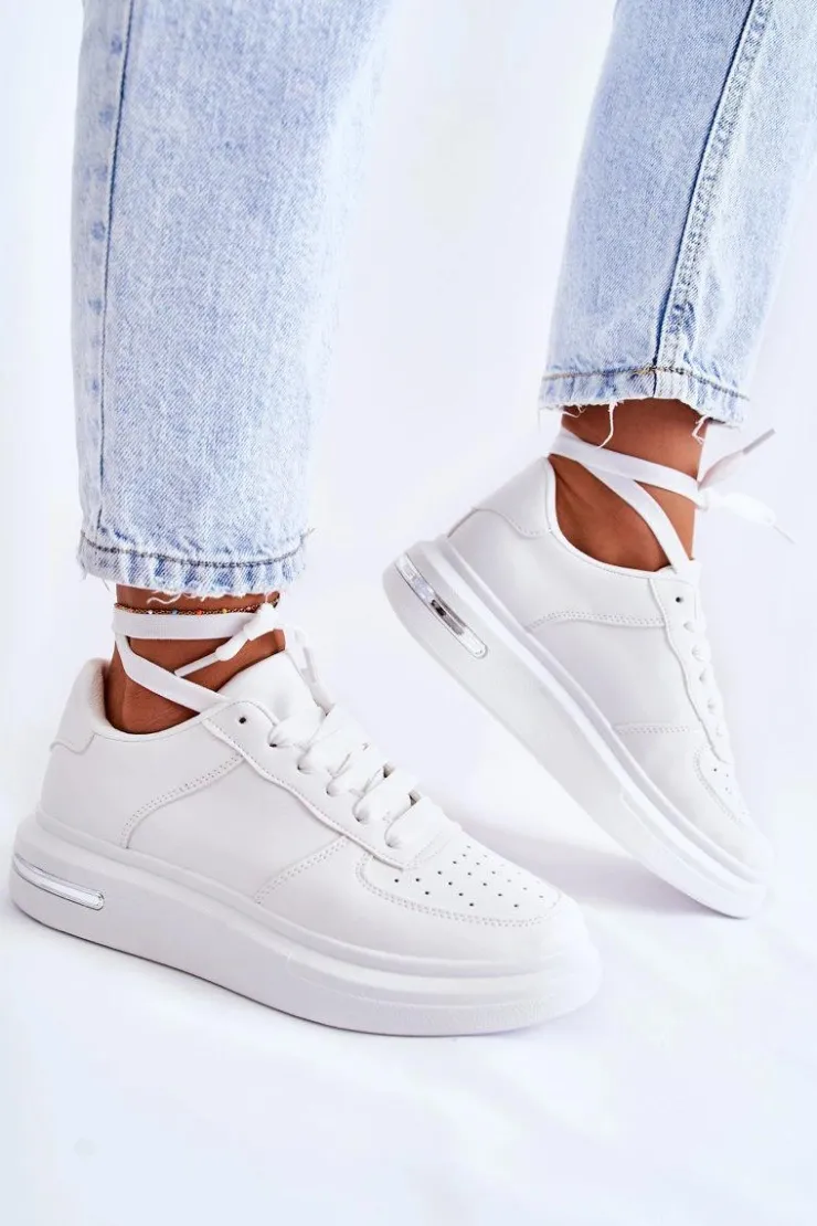 Klasyczne buty sportowe zostały wykonane z eko skóry. Osadzone na masywnej platformie z lustrzanym elementem. Model wiązany na płaskie sznurowadła. Miękka wkładka wykonana z pianki została pokryta tkaniną. Model z perforacją na przodzie, co pozwala na odpowiednią cyrkulację powietrza. Nosek zaokrąglony. Koniecznie powinnaś je mieć w swojej szafie! Przy wyborze rozmiaru prosimy kierować tabelą rozmiarów.