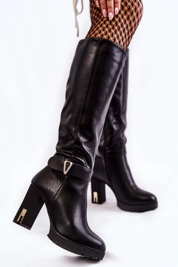 Kozaki damskie osadzone na zdobionym obcasie oraz platformie świetnie sprawdzą się w sezonie jesiennym! Wykonane z eko skóry. Posiadają pasek z ozdobą z imitacją cyrkonii. Kozaki zapinane na suwak. Posiadają w środku ocieplenie w postaci koca obuwniczego. Modny fason, który sprawdzi się w wielu stylizacjach! Przy wyborze rozmiaru prosimy sugerować się tabelą rozmiarów.