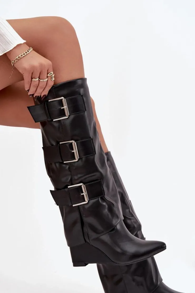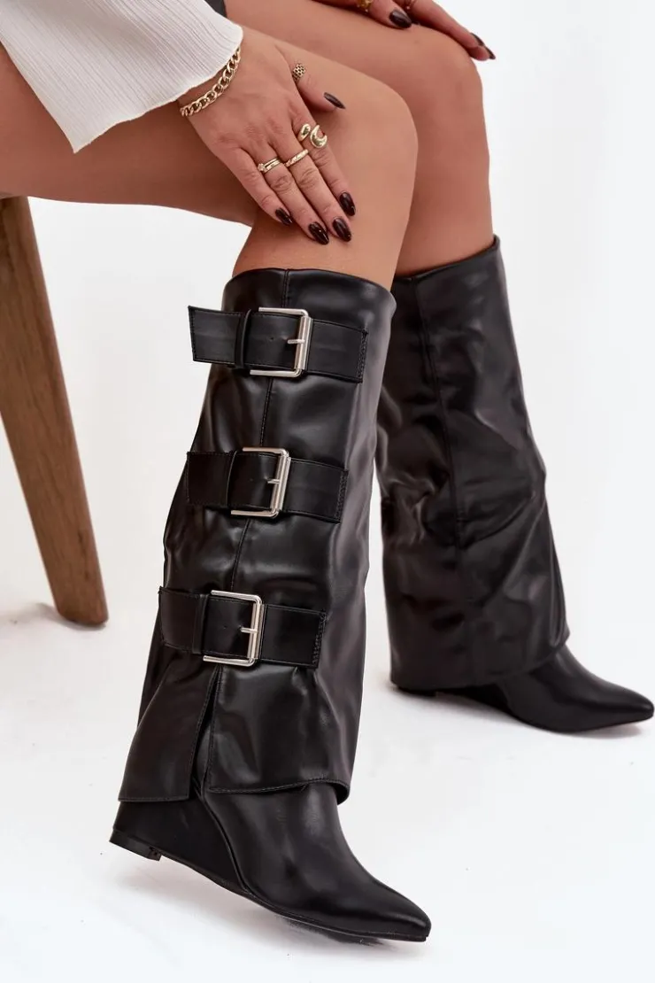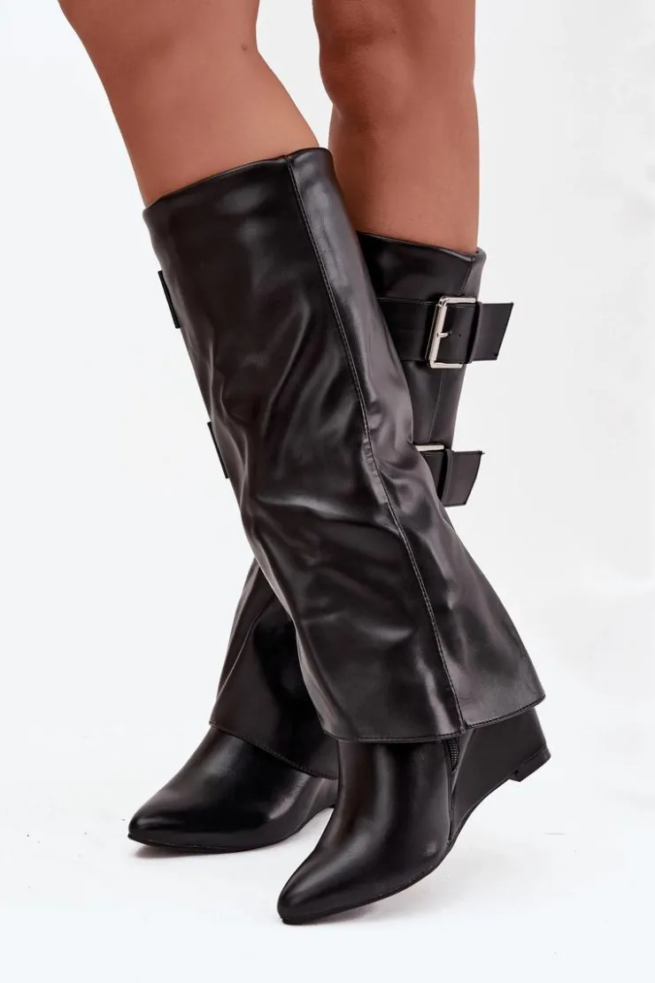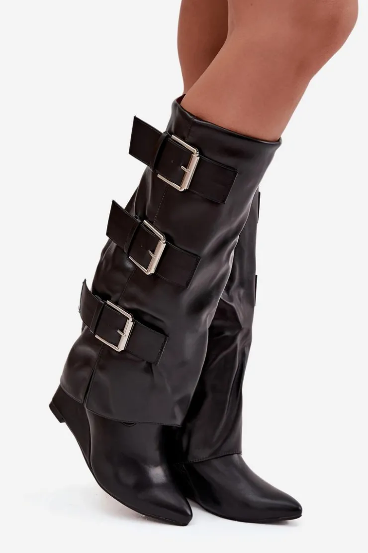 Kozaki damskie wykonane z eko skóry to stylowa propozycja dla kobiet, które lubią wyróżniać się eleganckim, nowoczesnym wyglądem. Model przyciąga uwagę wywiniętą cholewką, która zachodzi na obcas, nadając całości oryginalnego charakteru. Dodatkową ozdobą są duże, srebrne klamry umieszczone po bokach, które podkreślają modny i nieco rockowy styl obuwia. Szpiczaste noski optycznie wydłużają nogi i dodają kobiecego wdzięku. Kozaki są wsuwane, z dodatkowym zamkiem ułatwiającym zakładanie, co czyni je praktycznymi i wygodnymi w użytkowaniu. Osadzone na stabilnym koturnie, subtelnie unoszą sylwetkę, zapewniając jednocześnie komfort podczas noszenia. Wnętrze ocieplane miękkim materiałem gwarantuje ciepło w chłodniejsze dni. To idealny wybór dla kobiet, które cenią połączenie elegancji, wygody i nowoczesnego wyglądu – doskonałe zarówno do jeansów, jak i do sukienek czy spódnic. Przy wyborze rozmiaru prosimy sugerować się tabelą rozmiarów.