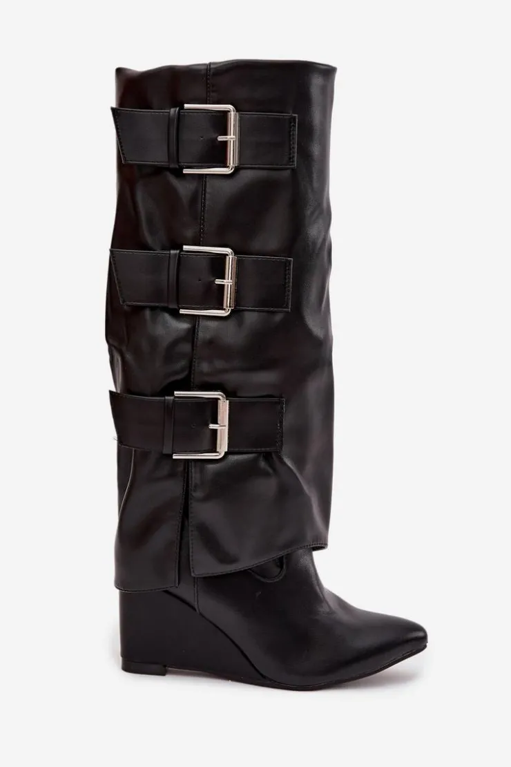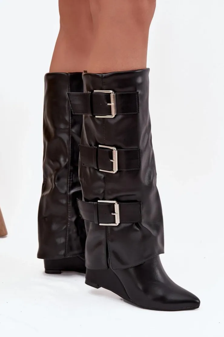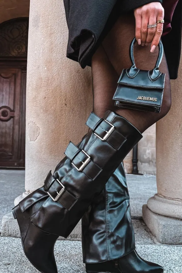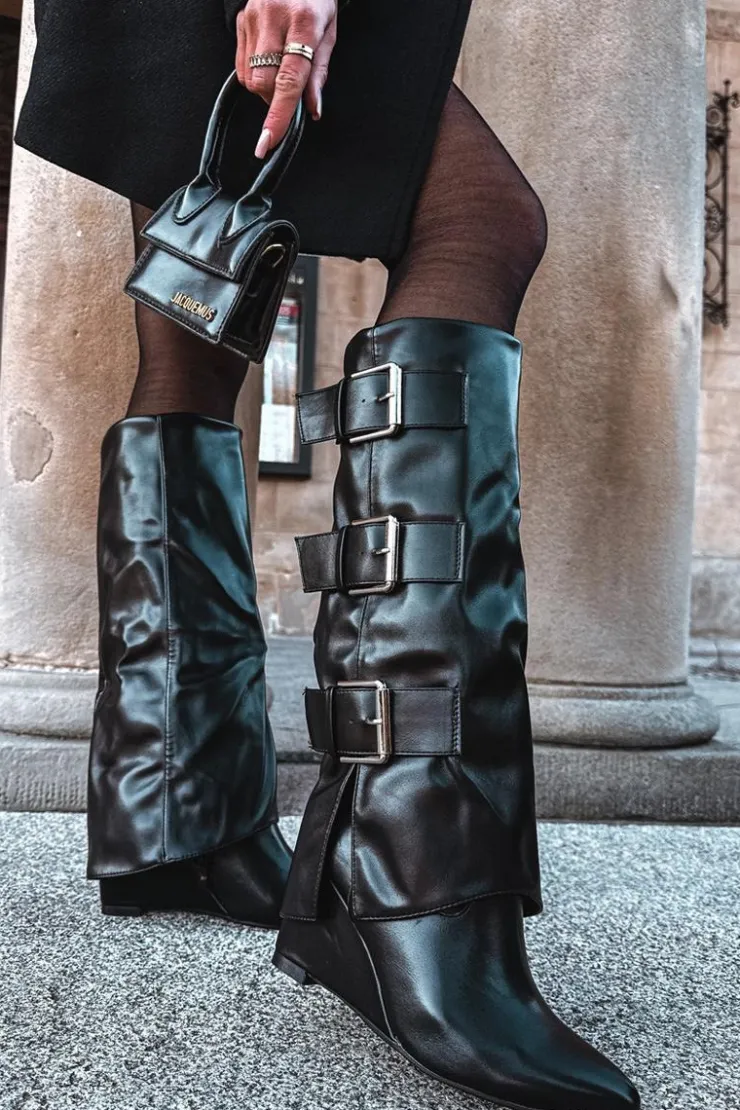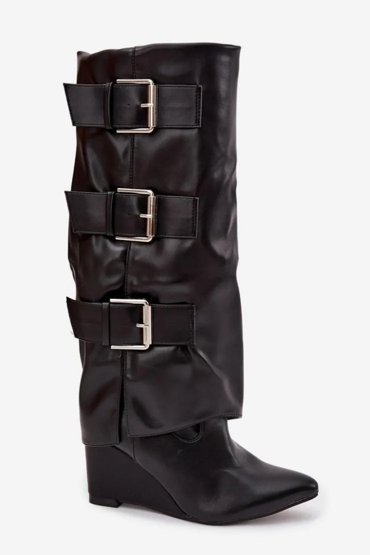 Kozaki damskie wykonane z eko skóry to stylowa propozycja dla kobiet, które lubią wyróżniać się eleganckim, nowoczesnym wyglądem. Model przyciąga uwagę wywiniętą cholewką, która zachodzi na obcas, nadając całości oryginalnego charakteru. Dodatkową ozdobą są duże, srebrne klamry umieszczone po bokach, które podkreślają modny i nieco rockowy styl obuwia. Szpiczaste noski optycznie wydłużają nogi i dodają kobiecego wdzięku. Kozaki są wsuwane, z dodatkowym zamkiem ułatwiającym zakładanie, co czyni je praktycznymi i wygodnymi w użytkowaniu. Osadzone na stabilnym koturnie, subtelnie unoszą sylwetkę, zapewniając jednocześnie komfort podczas noszenia. Wnętrze ocieplane miękkim materiałem gwarantuje ciepło w chłodniejsze dni. To idealny wybór dla kobiet, które cenią połączenie elegancji, wygody i nowoczesnego wyglądu – doskonałe zarówno do jeansów, jak i do sukienek czy spódnic. Przy wyborze rozmiaru prosimy sugerować się tabelą rozmiarów.