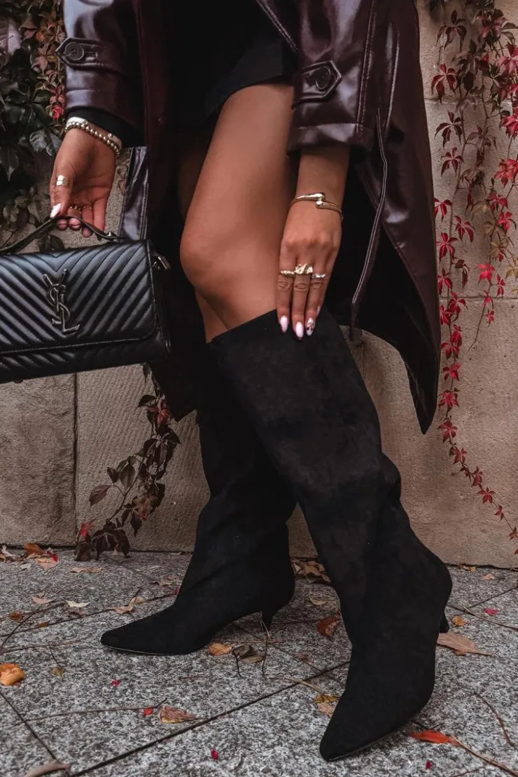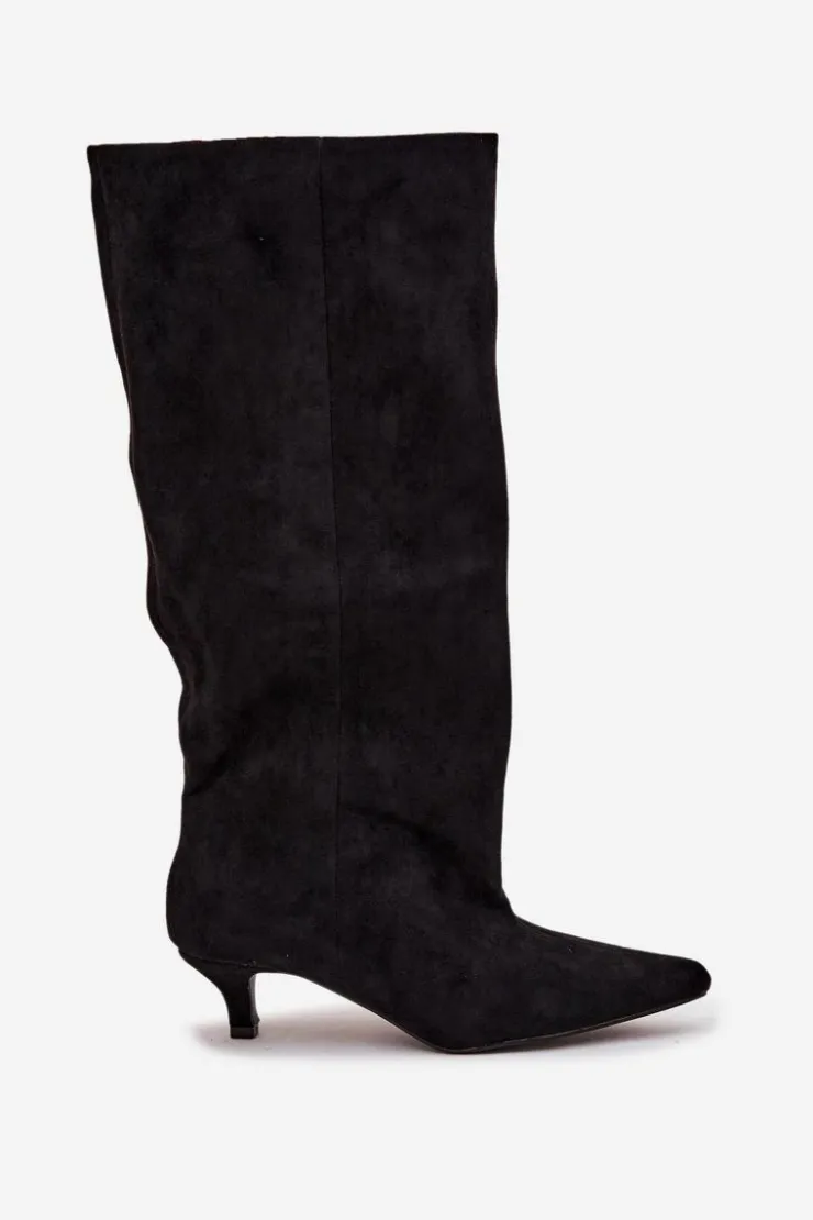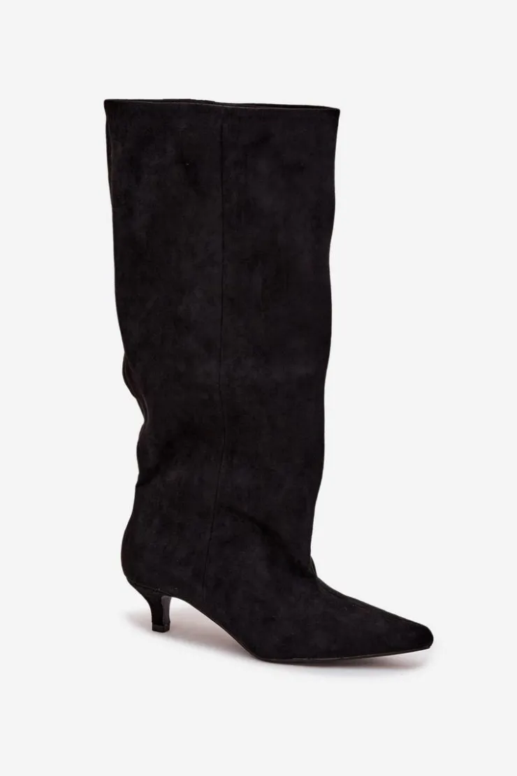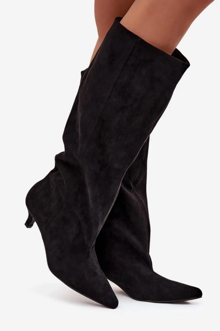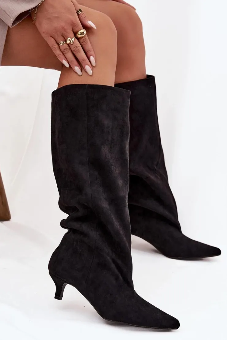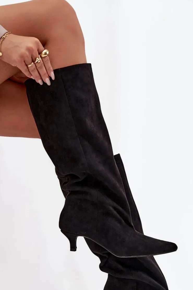 Kozaki damskie z eko zamszu to połączenie wygody i ponadczasowej elegancji. Model wsuwany, z luźną cholewką, doskonale układa się na nodze, podkreślając jej smukły kształt. Niski obcas zapewnia komfort przez cały dzień. Przeszycie biegnące wzdłuż cholewki z przodu optycznie wydłuża nogę. Idealne zarówno do sukienek, jak i dopasowanych spodni – perfekcyjny wybór na co dzień i na wyjątkowe okazje. Przy wyborze rozmiaru prosimy sugerować się tabelą rozmiarów.