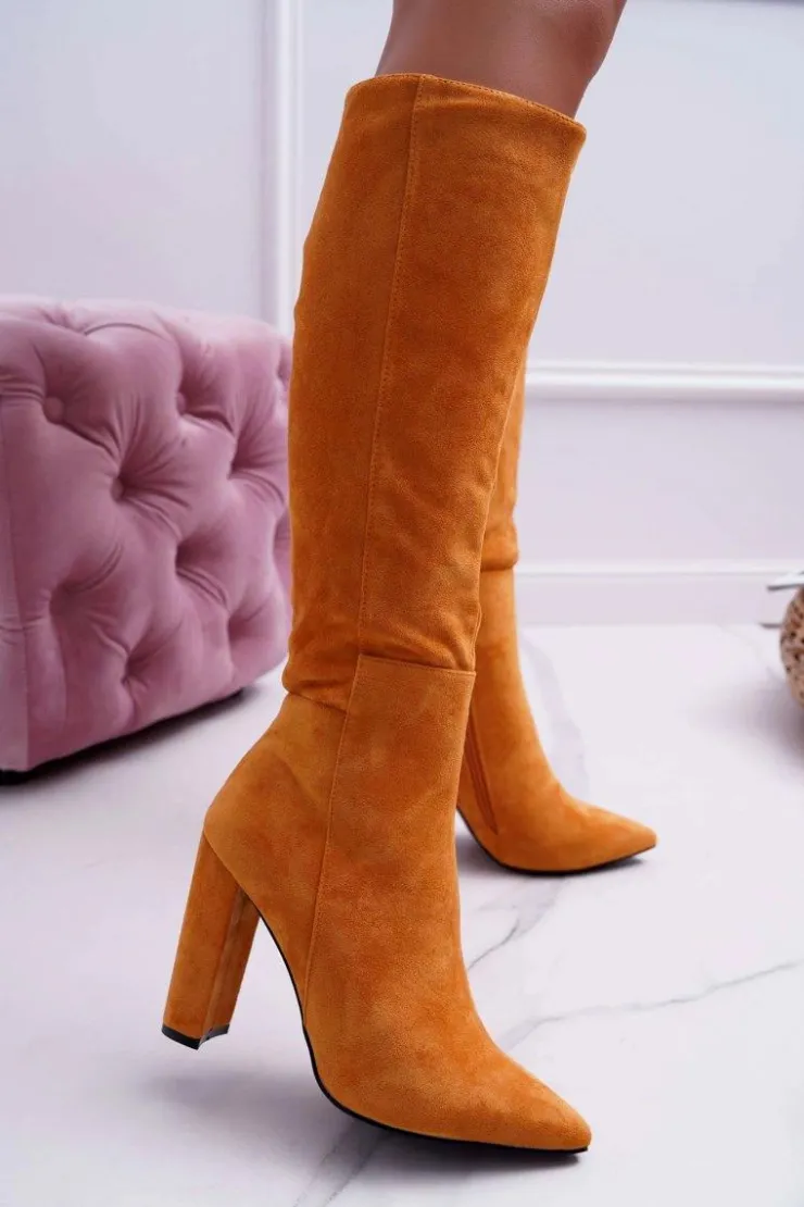 Modne botki na słupku, w całości wykonane z ekozamszu. Delikatny słupek uniesie i optycznie wysmukli sylwetkę. Wysokość do kolana. Przy wyborze rozmiaru prosimy sugerować się tabelą rozmiarów.