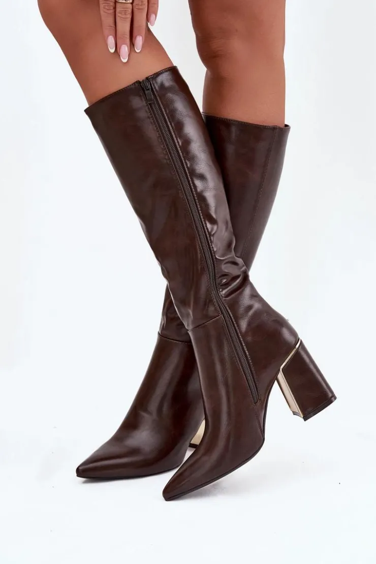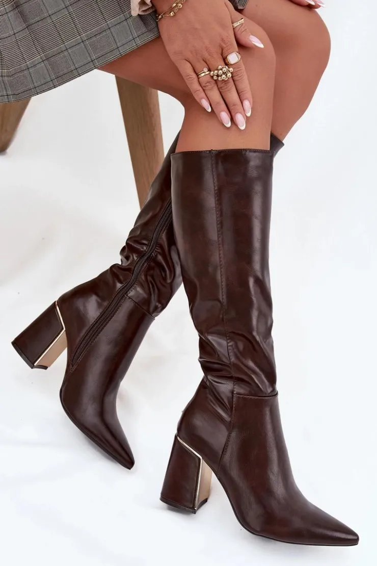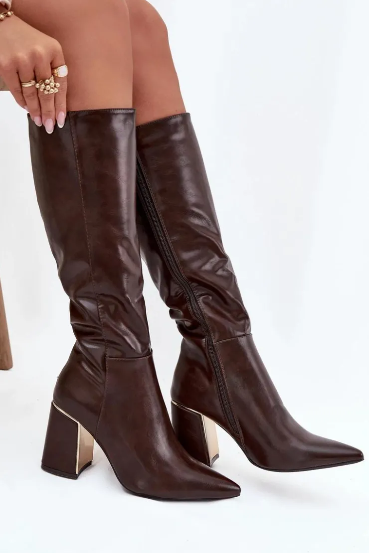Kozaki na słupku ze złotym akcentem to elegancka propozycja dla kobiet. Model ze szpiczastymi noskami i cholewką sięgającą przed kolano podkreśla kobiecą sylwetkę, a zamek zapewnia łatwe zakładanie i idealne dopasowanie do nogi. Świetnie sprawdzą się w stylizacjach z sukienkami i spódnicami. Przy wyborze rozmiaru prosimy sugerować się tabelą rozmiarów.