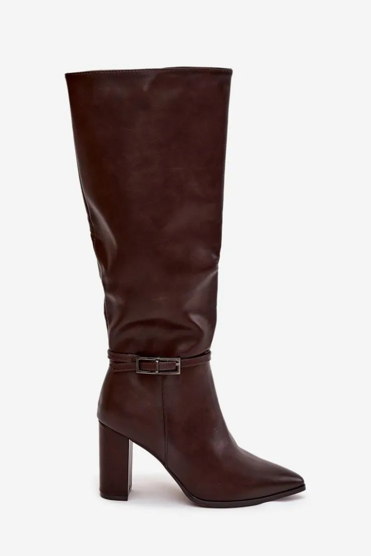 Damskie Boto Kozaki Damskie Ocieplane Na Słupku Z Klamrą Czekoladowe Fionelle