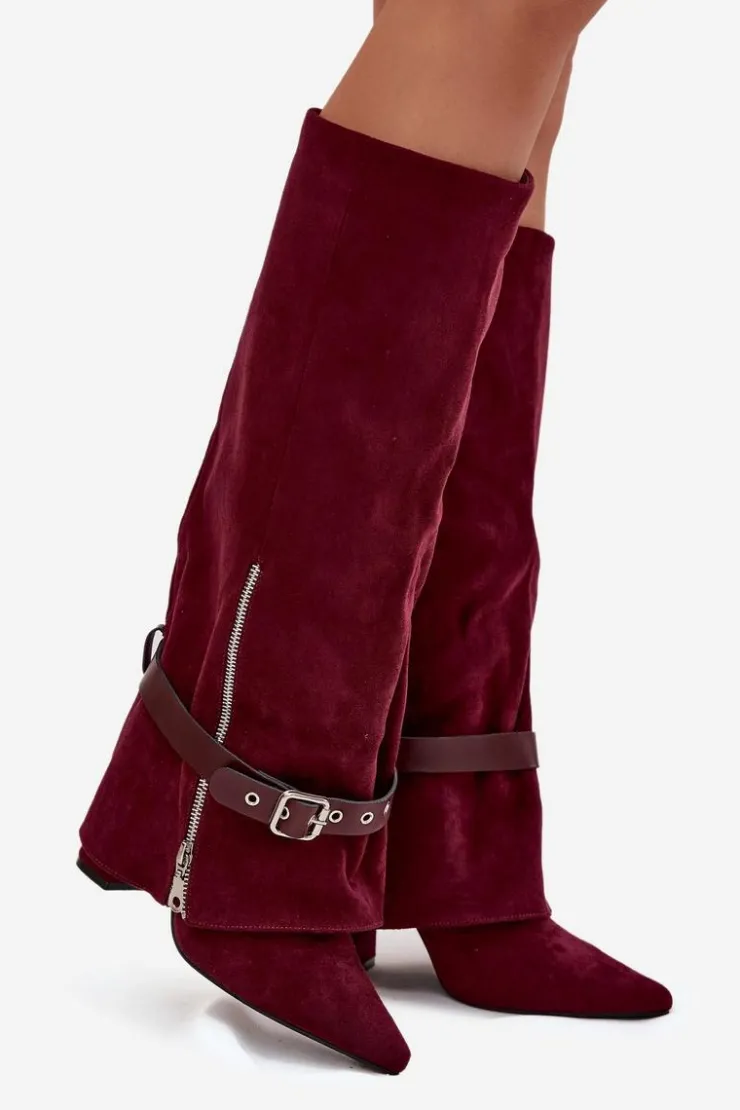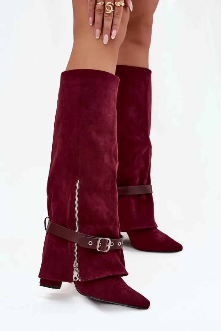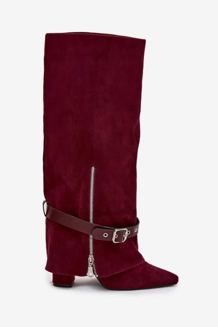 Wsuwane kozaki damskie przed kolano to elegancka i stylowa propozycja, która łączy klasykę z nowoczesnym akcentem. Model ze szpiczastymi noskami i obcasem typu słupek subtelnie wysmukla sylwetkę, a cholewka nachodząca na obcas nadaje całości wyjątkowego charakteru. Dodatkowy pasek z ozdobną klamrą można ściągnąć lub dowolnie ustawić, zmieniając styl butów i dopasowując je do różnych stylizacji. Idealne do sukienek, spódnic, jak i eleganckich zestawów casualowych, wprowadzają modny, kobiecy akcent do każdej garderoby. Przy wyborze rozmiaru prosimy sugerować się tabelą rozmiarów.