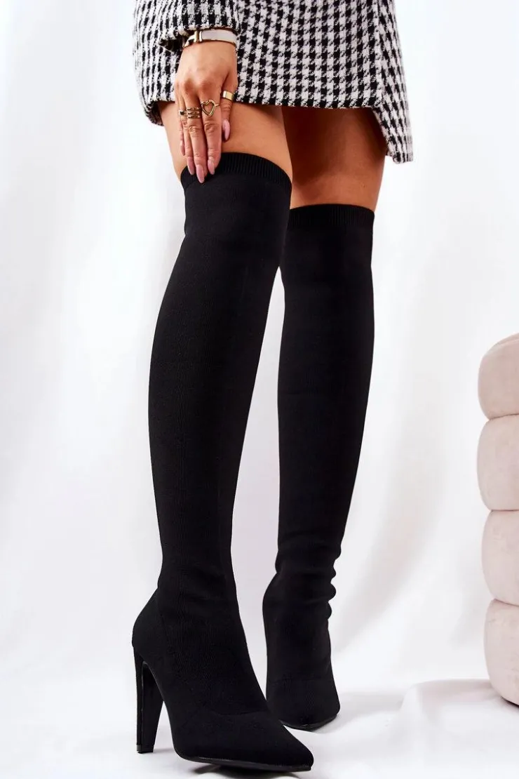 Wysokie kozaki za kolano są wykonane z elastycznego materiału tekstylnego, dzięki temu cholewka dopasuje się do tęgości nogi. U góry cholewki znajduje się ściągacz. Nosek w szpic. Obcas pokryty jest eko zamszem. Wkładka jest wykonana z eko skóry. Kozaki te świetnie będą się prezentować wraz z sukienkami czy spódniczkami. Przy wyborze rozmiaru prosimy sugerować się tabelą rozmiarów.
