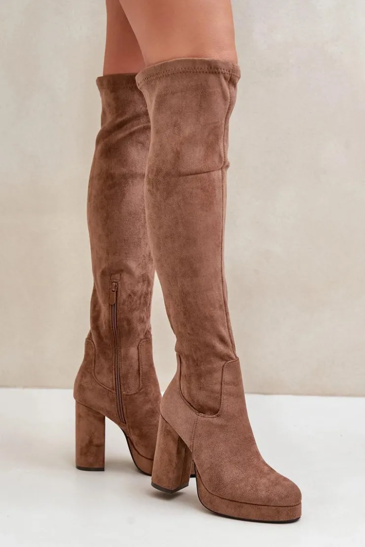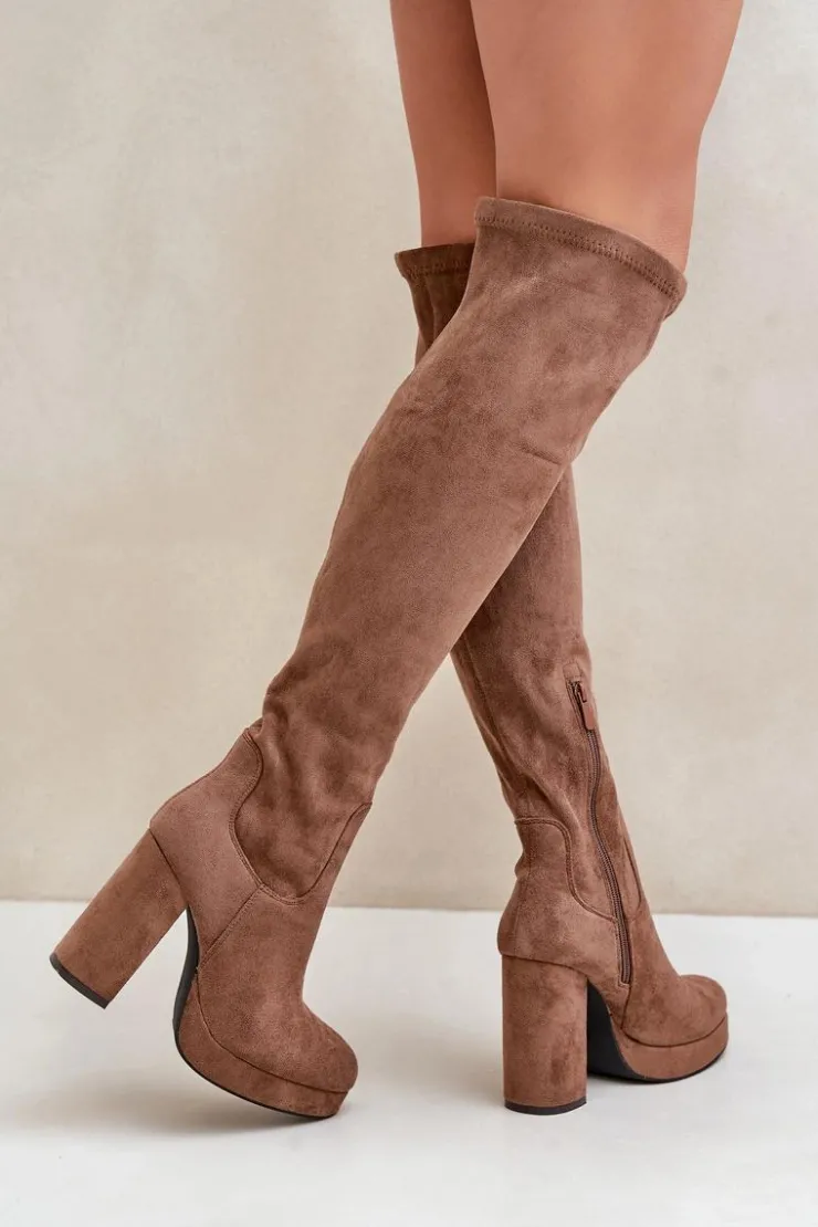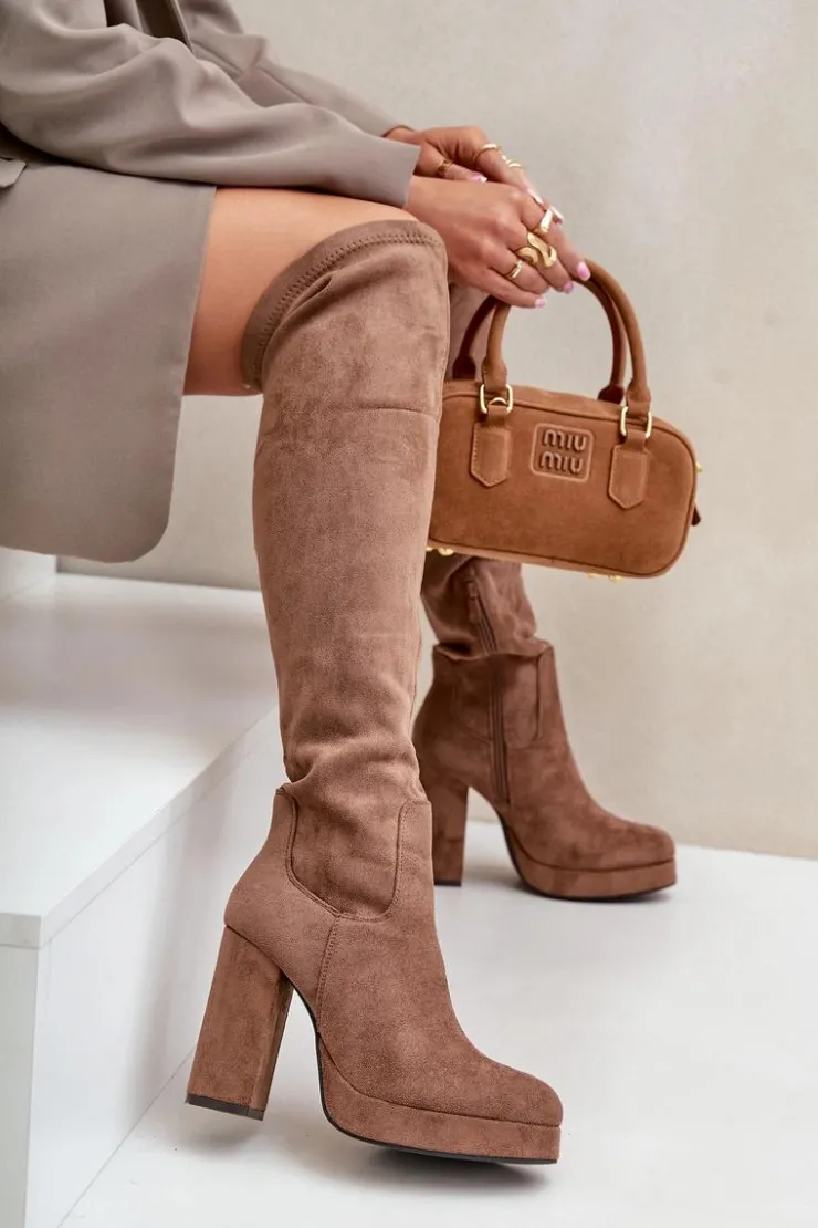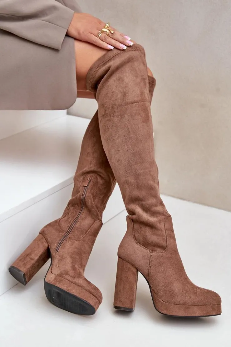 Kozaki damskie z eko zamszu to świetna propozycja dla miłośniczek modnych butów na chłodniejsze dni. Osadzone na obcasie w formie słupka i platformie. Kozaki są wsuwane, ale dla większej wygody posiadają dodatkowy suwak na dole cholewki, ułatwiający zakładanie. Noski zaokrąglone. Wnętrze ocieplone jest wyłącznie na wysokości stopy. Idealne do stylizacji z sukienkami czy spódnicami. Przy wyborze rozmiaru prosimy sugerować się tabelą rozmiarów.