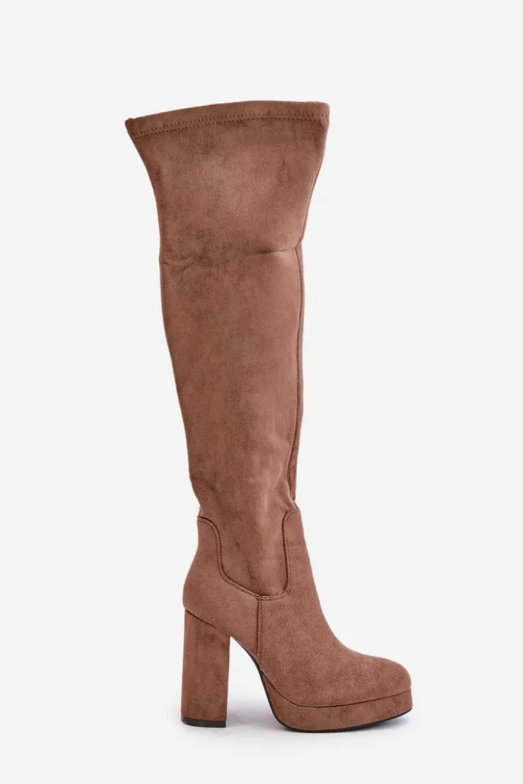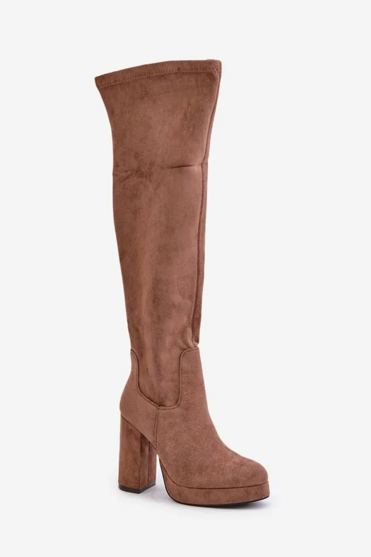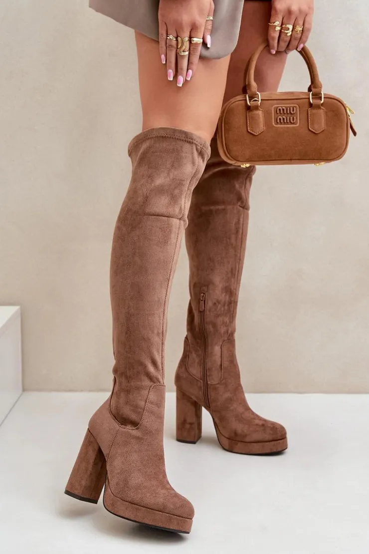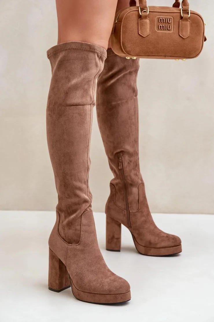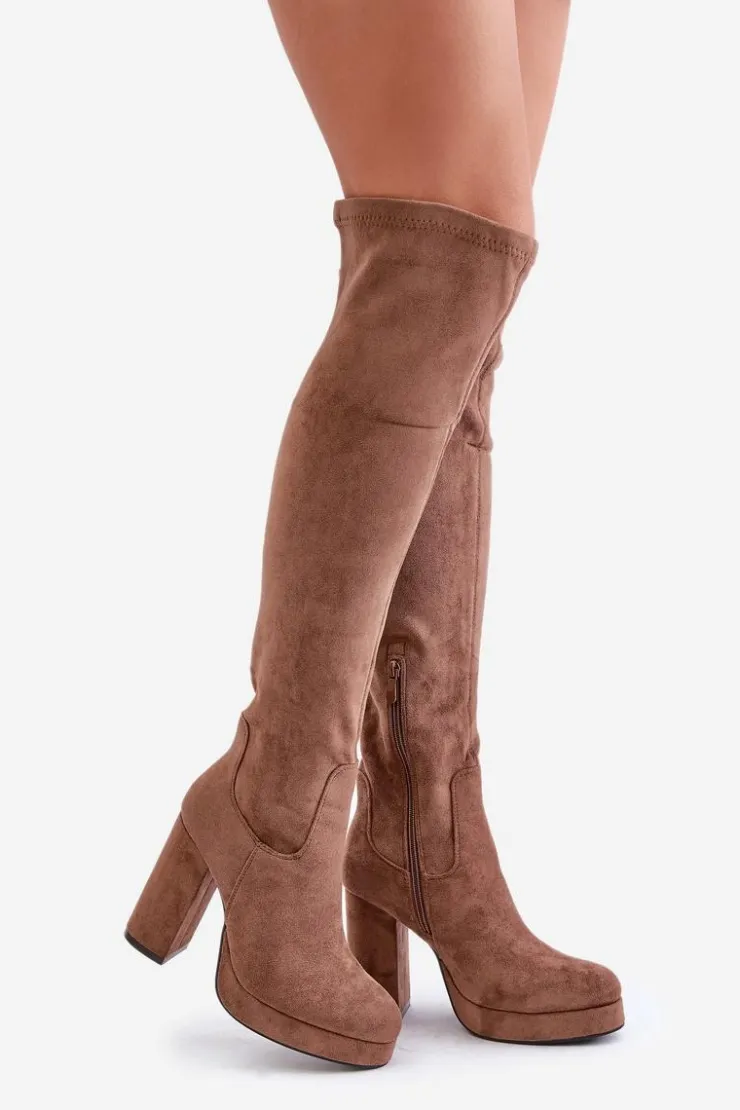 Kozaki damskie z eko zamszu to świetna propozycja dla miłośniczek modnych butów na chłodniejsze dni. Osadzone na obcasie w formie słupka i platformie. Kozaki są wsuwane, ale dla większej wygody posiadają dodatkowy suwak na dole cholewki, ułatwiający zakładanie. Noski zaokrąglone. Wnętrze ocieplone jest wyłącznie na wysokości stopy. Idealne do stylizacji z sukienkami czy spódnicami. Przy wyborze rozmiaru prosimy sugerować się tabelą rozmiarów.