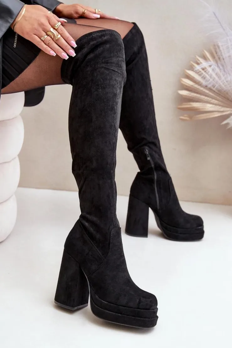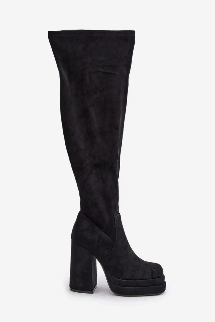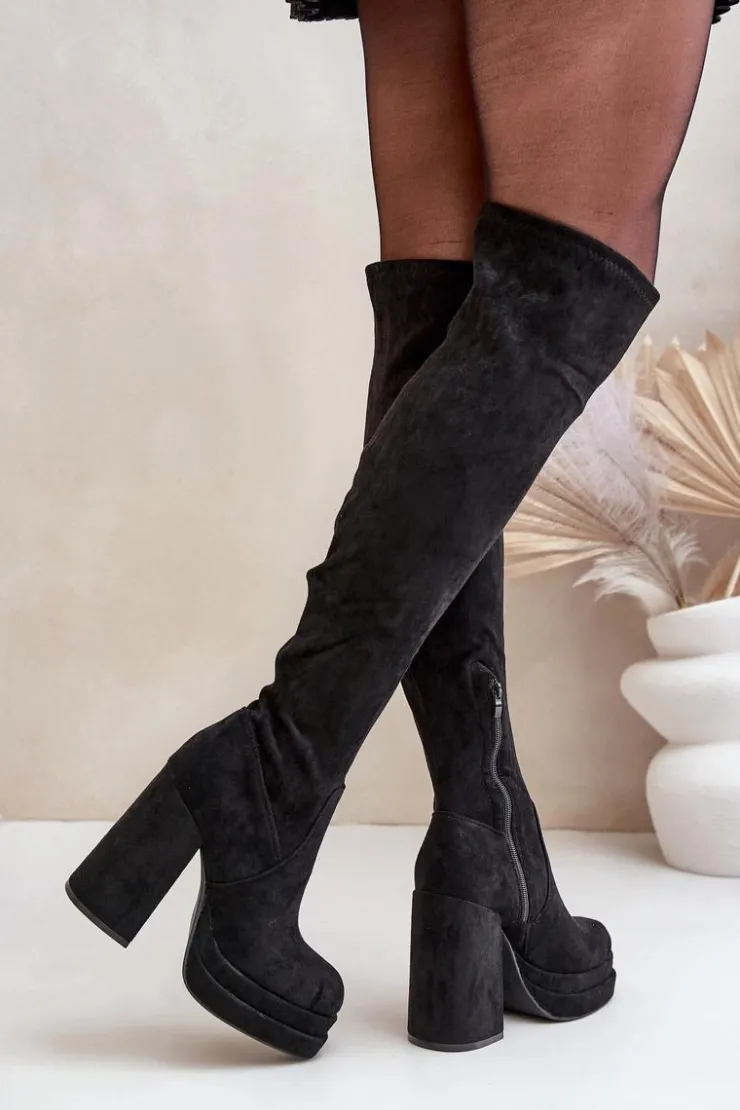 Kozaki z eko zamszu to świetna propozycja dla miłośniczek modnych, a zarazem wygodnych butów na chłodniejsze dni. Model wyróżnia się wysoką cholewką sięgającą za kolano, która dodaje elegancji i wydłuża sylwetkę. Kozaki są wsuwane, ale dla większej wygody posiadają dodatkowy suwak na dole cholewki, ułatwiający zakładanie. Osadzone na masywnym słupku oraz platformie, zapewniają stabilność i podkreślają nogi. Wnętrze ocieplone jest wyłącznie na wysokości stopy. Idealne do stylizacji z sukienkami czy spódnicami. Przy wyborze rozmiaru prosimy sugerować się tabelą rozmiarów.