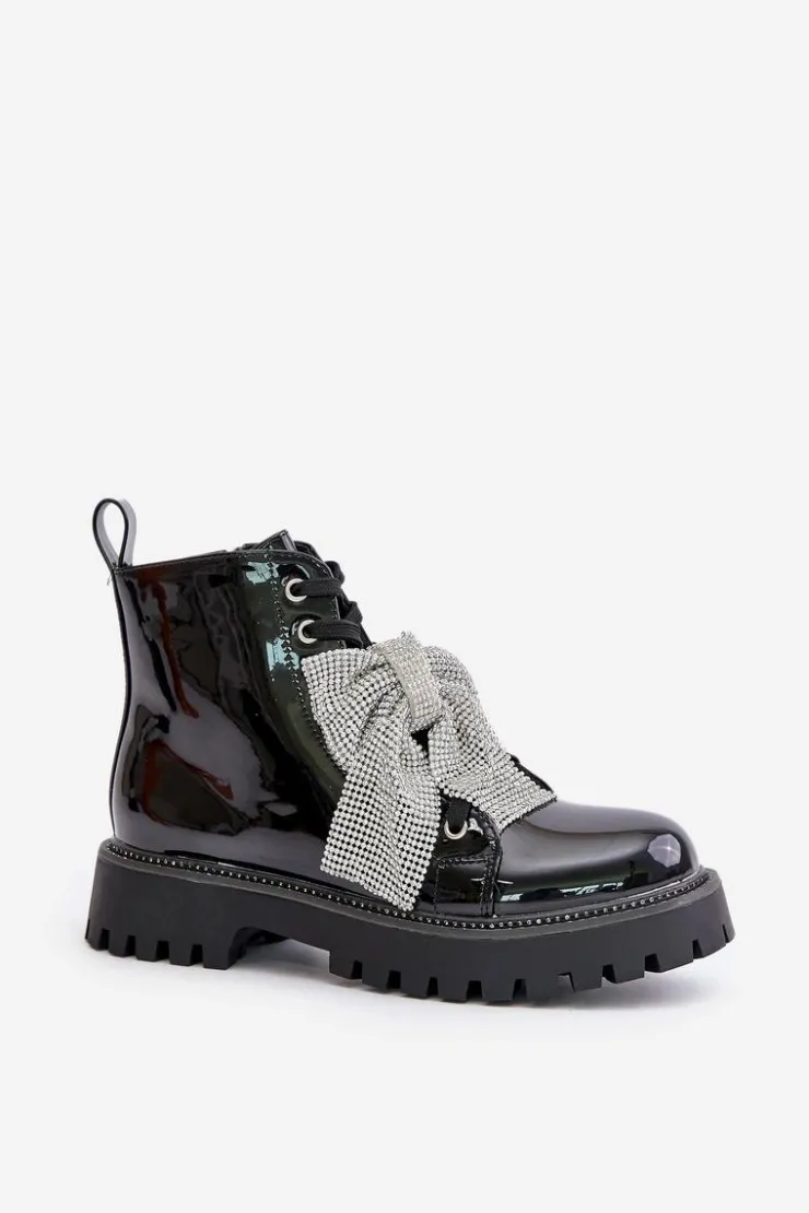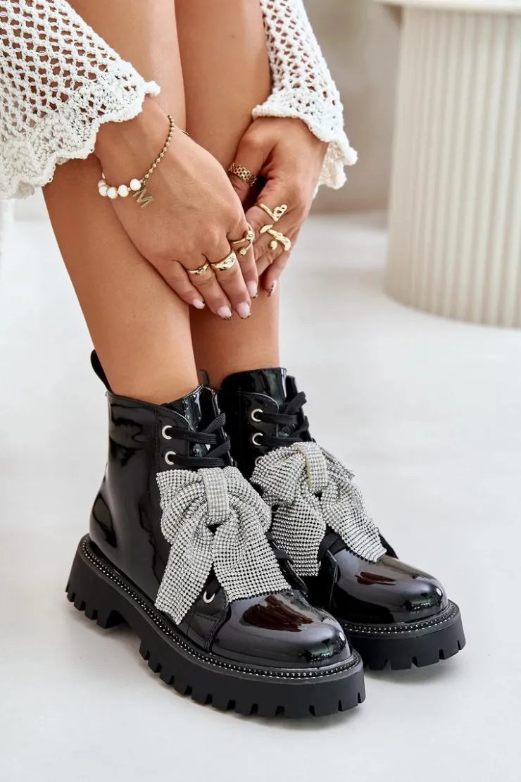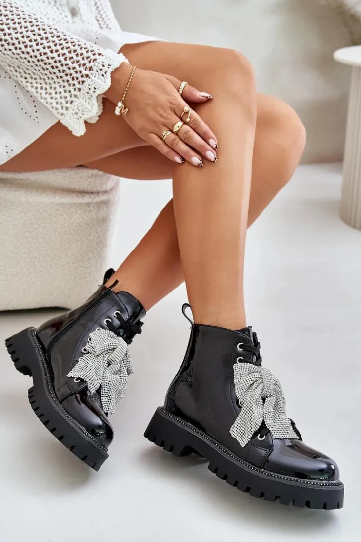 Botki na płaskim obcasie łączą w sobie wygodę i styl, idealnie wpisując się w codzienne i wyjątkowe stylizacje. Zaokrąglone noski nadają im klasyczny wygląd. Zapięcie na zamek ułatwia szybkie zakładanie, a dodatkowe sznurowanie pozwala na idealne dopasowanie do stopy. Główną zaletą tego modelu jest kokarda z cyrkoniami umieszczona z przodu, która dodaje eleganckiego i kobiecego akcentu, przyciągając wzrok i podkreślając wyjątkowość tego obuwia. Przy wyborze rozmiaru prosimy sugerować się tabelą rozmiarów.