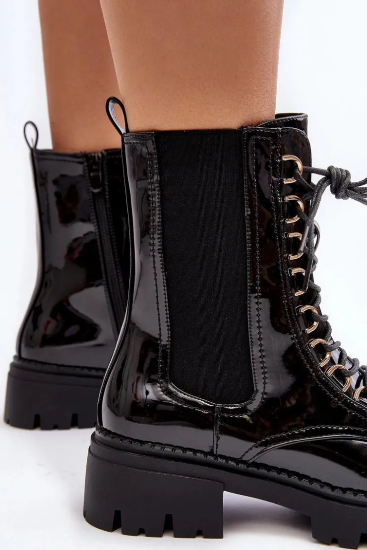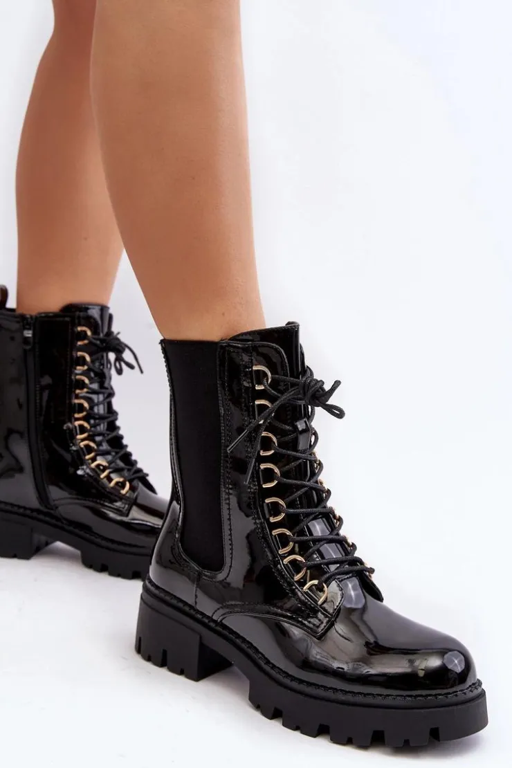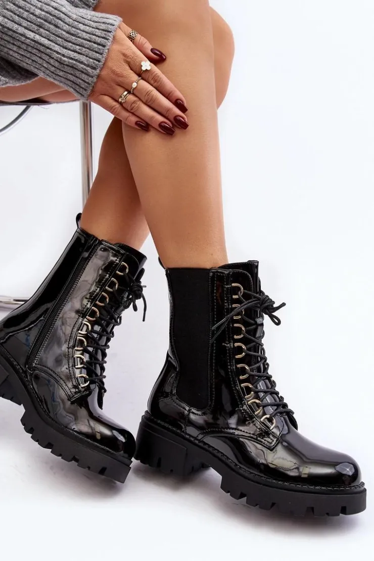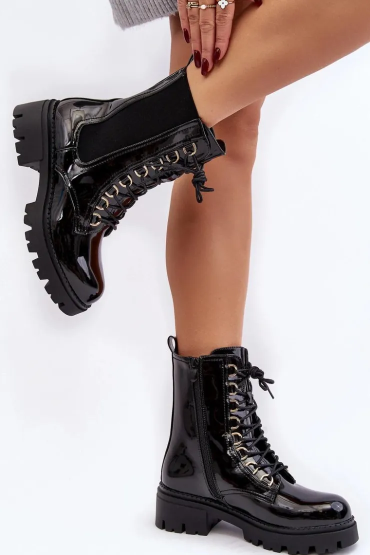 Damskie botki wykonane z eko skóry. Osadzone na płaskim obcasie. Na cholewce elastyczne wstawki. Noski zaokrąglone. Model ten zapinany jest na suwak z boku oraz dodatkowo posiada sznurowanie. Wnętrze ocieplone kocem obuwniczym. Świetny model do jesiennych i zimowych stylizacji! Przy wyborze rozmiaru prosimy sugerować się tabelą rozmiarów.