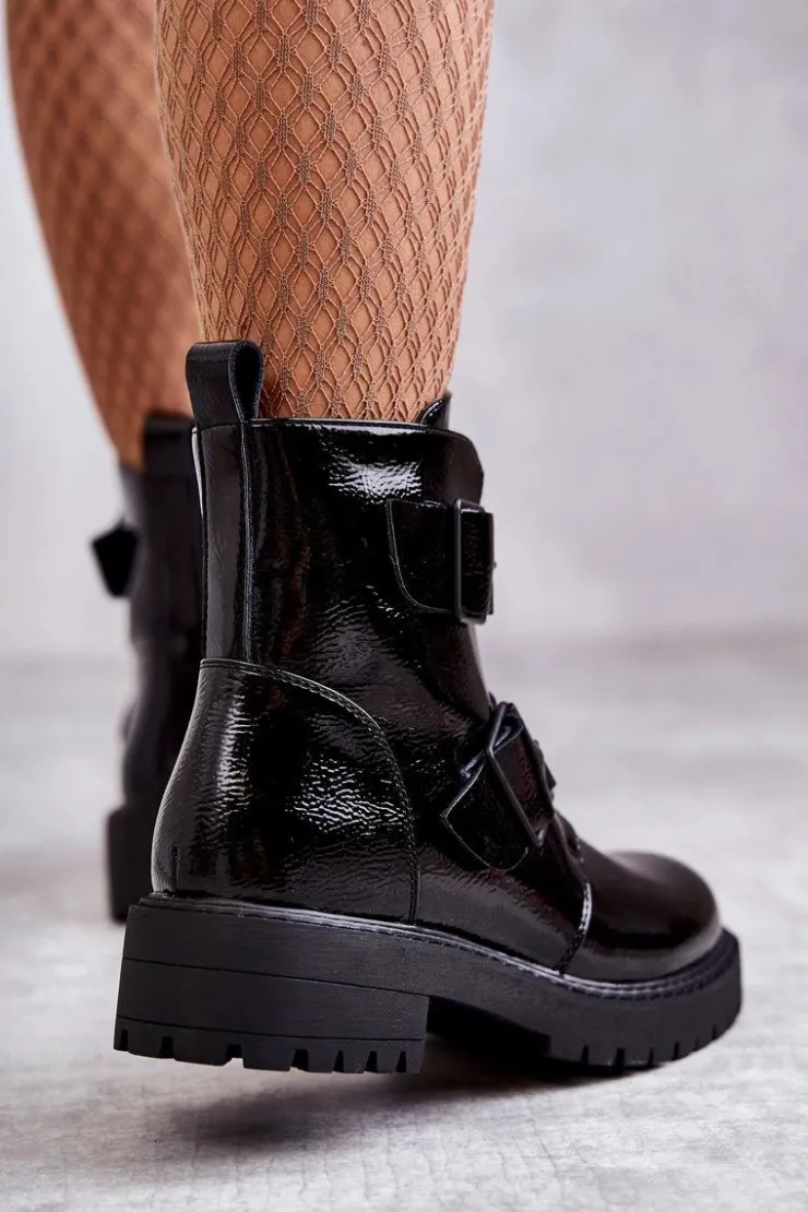 Klasyczne botki damskie zostały wykonane z eko skóry. Posiadają ozdobne paski z klamrami na boku cholewki. Model zapinany na suwak. Osadzone na płaskim obcasie oraz platformie wraz ze żłobieniem. Botki są ocieplane w środku kocem obuwniczym. Posiadają usztywniany zapiętek. Modne obuwie, które świetnie sprawdzi się do pracy, szkoły. Przy wyborze rozmiaru prosimy sugerować się tabelą rozmiarów.