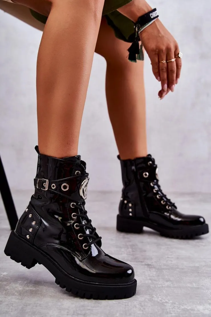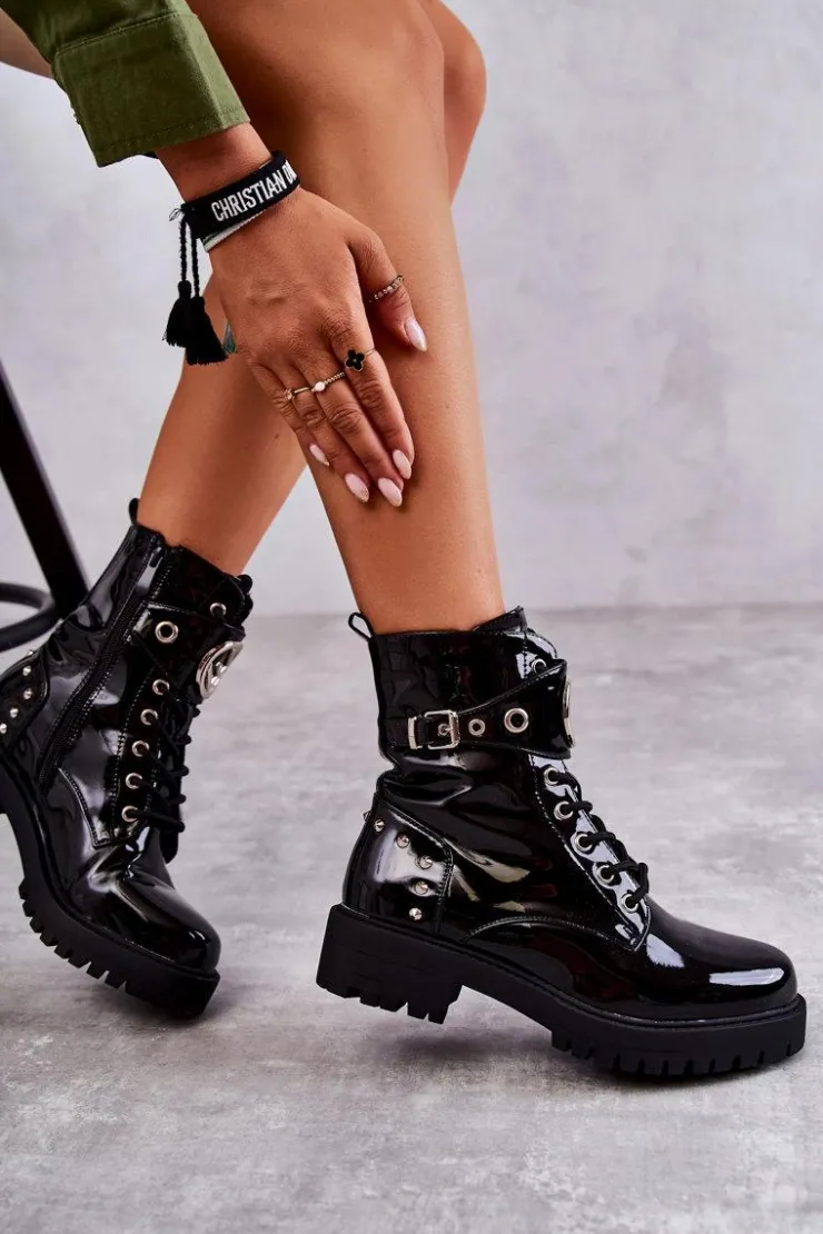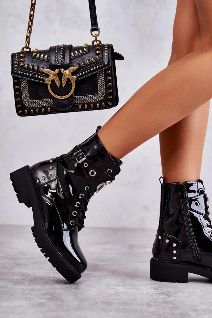 Modne damskie botki świetnie sprawdzą się podczas jesiennych stylizacji! Wykonane z eko skóry. Dodatkowo zostały przyozdobione ćwiekami oraz emblematem z tworzywa sztucznego. Botki posiadają klasyczne wiązanie oraz suwak. W środku znajduje się ocieplenie w postaci koca obuwniczego. Osadzone na płaskim obcasie oraz platformie. Przy wyborze rozmiaru prosimy sugerować się tabelą rozmiarów.