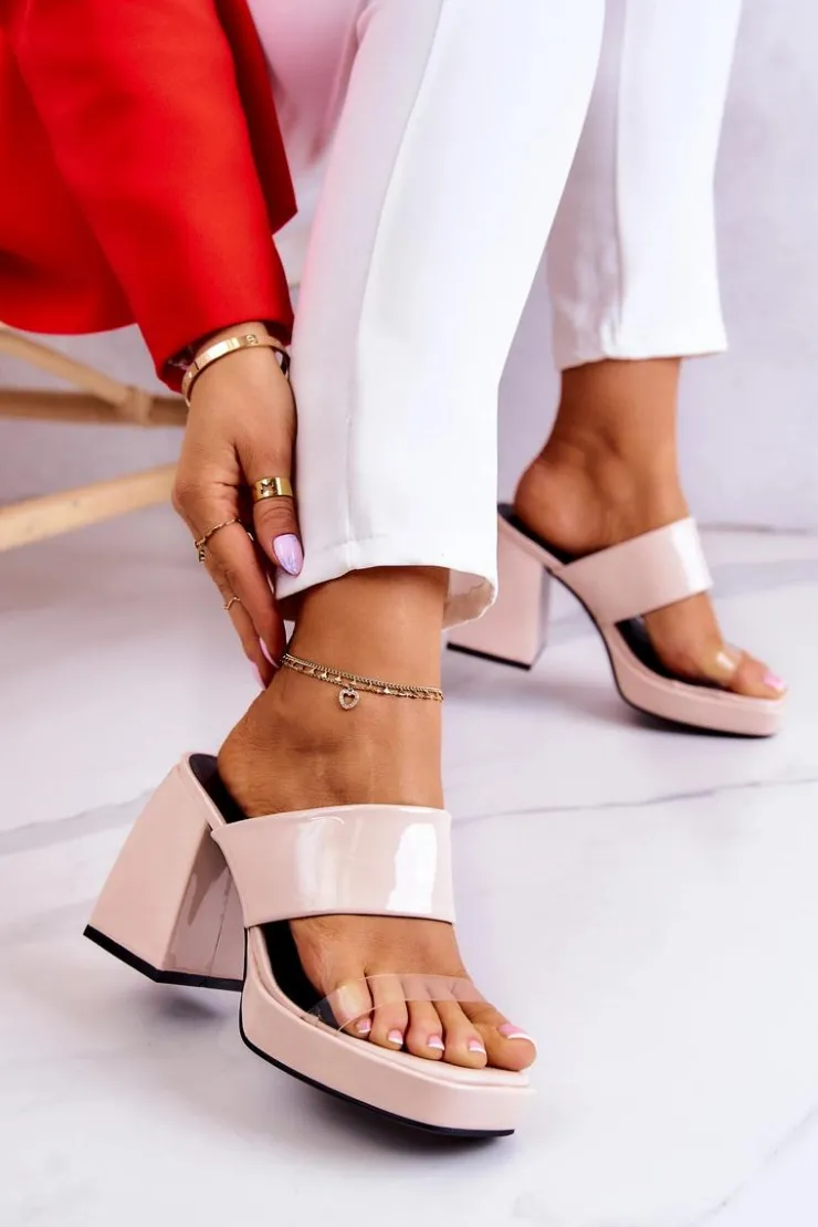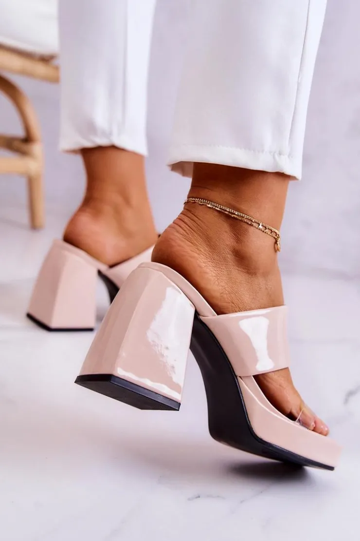 Klapki na wyjątkowym, szerokim obcasie w postaci słupka. Przód osadzony na platformie z otwartym, kwadratowym noskiem. Stopę podtrzymują dwa paski. Model klasyczny, wsuwany, z odkrytą piętą. Wykonane w całości z eko skóry. Posiadają miękką, eko skórzaną wkładkę. W tych butach na pewno zachwycisz wiele osób! Stylowe, komfortowe w użytkowaniu oraz stabilne. Ten model powinien znaleźć się właśnie u Ciebie! Przy wyborze rozmiaru prosimy kierować się tabelą rozmiarów.