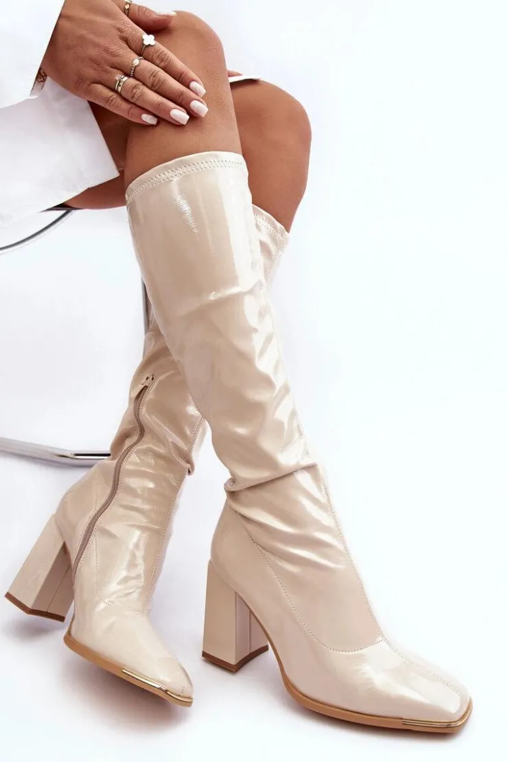 Kozaki damskie z cholewką przed kolano. Wykonane z eko skóry. Osadzone na obcasie w postaci słupka. Noski w kwadrat. Nieocieplane. Model wsuwany z dodatkowym suwakiem na dole cholewki. Idealny model zarówno do sukienek, jak i spodni! Przy wyborze rozmiaru prosimy sugerować się tabelą rozmiarów.