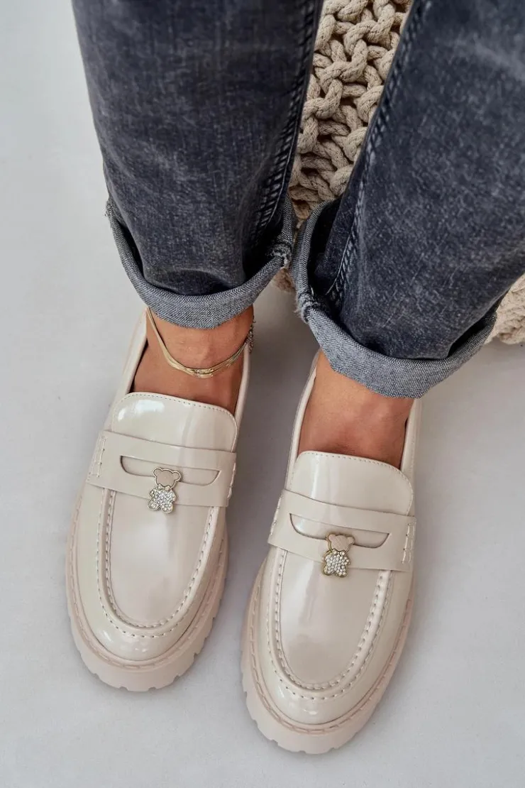 Damskie Boto Lakierowane Mokasyny Damskie Z Przypinką Miś Beżowe Wulinea