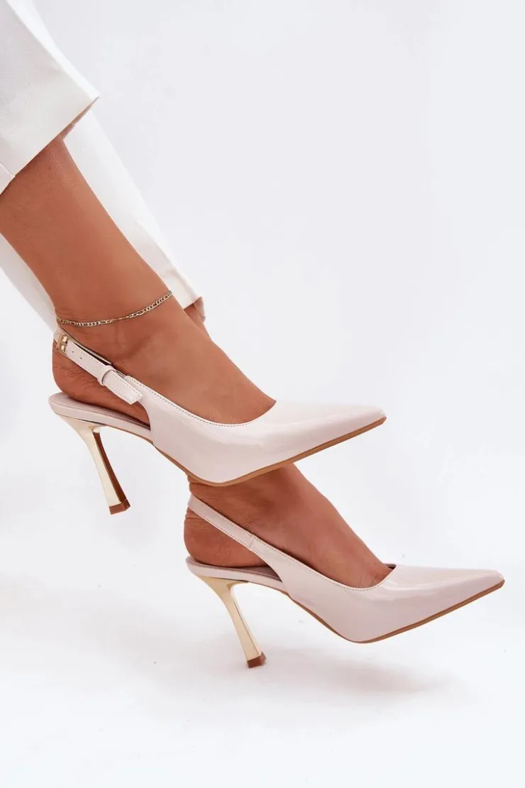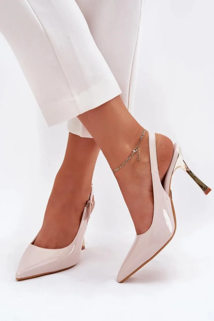 Lakierowane eleganckie szpilki z odkrytą piętą to połączenie klasyki i nowoczesności. Szpiczaste noski optycznie wysmuklają nogi, a zapinane na regulowany pasek ze sprzączką, zapewniają idealne dopasowanie i stabilność. Te szpilki doskonale sprawdzą się na specjalne okazje, łącząc elegancję z subtelnym, ale wyrazistym stylem. Idealne do wieczorowych stylizacji, dodają szyku i pewności siebie. Przy wyborze rozmiaru prosimy sugerować się tabelą rozmiarów.
