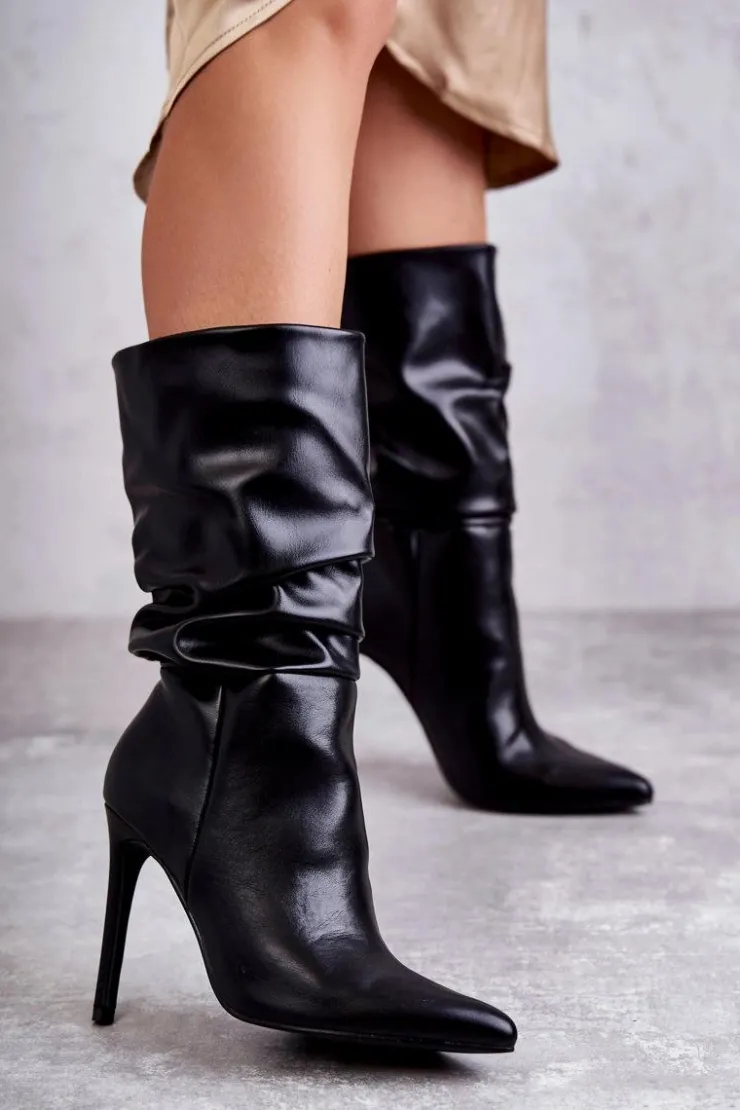 Modne kozaki damskie wykonane z eko skóry. Cholewka z marszczeniem podkreśli Twoje stylizacje! Kozaki zostały osadzone na obcasie w postaci szpilki. Nosek w szpic dodatkowo wysmukli nogi. Model wsuwany z usztywnianym zapiętkiem. Idealnie będą komponować się z plisowanymi spódnicami czy dzianinowymi sukienkami. Koniecznie sprawdź także pozostałe modele dostępne w naszej ofercie! Przy wyborze rozmiaru prosimy sugerować się tabelą rozmiarów.