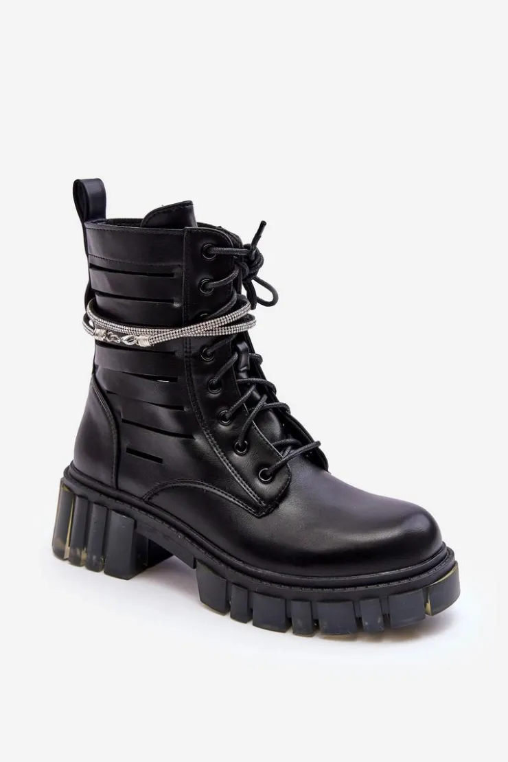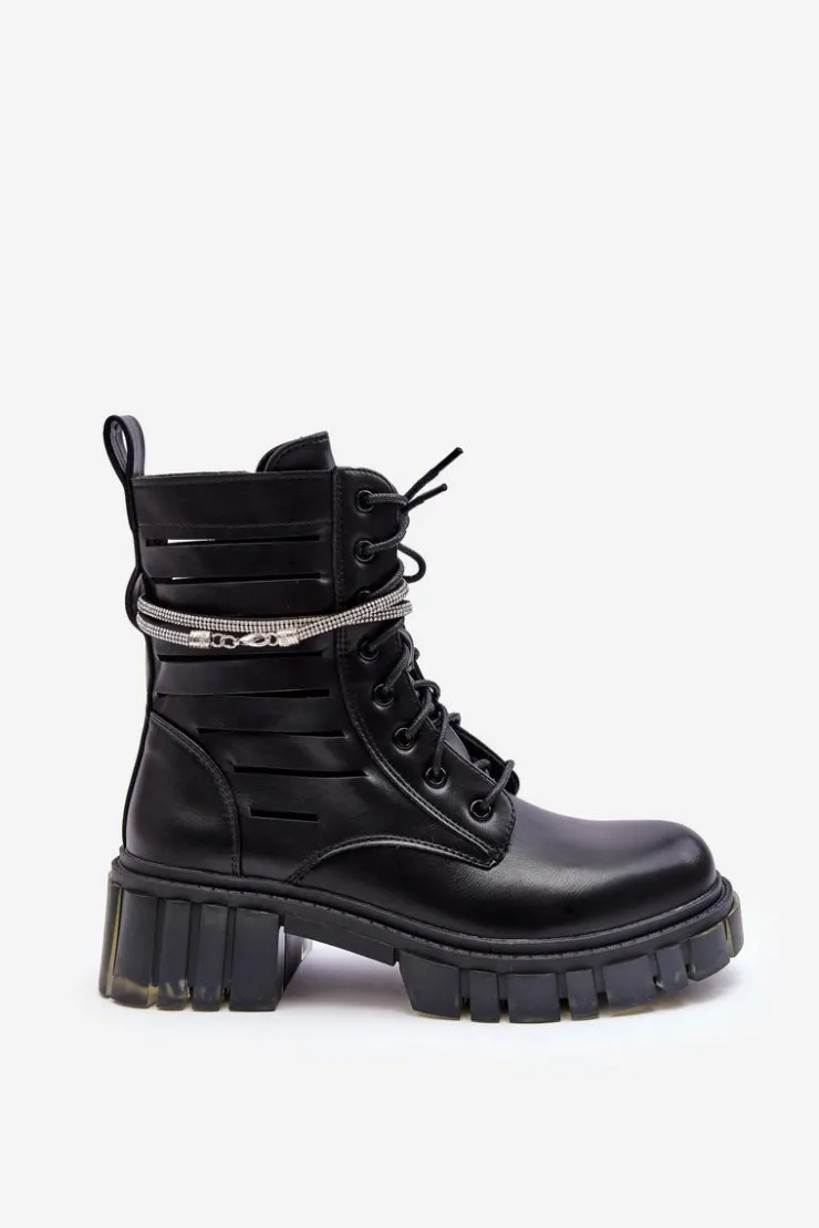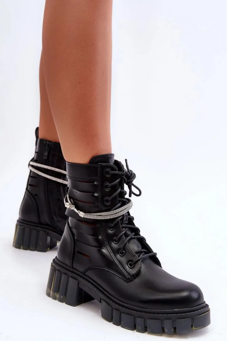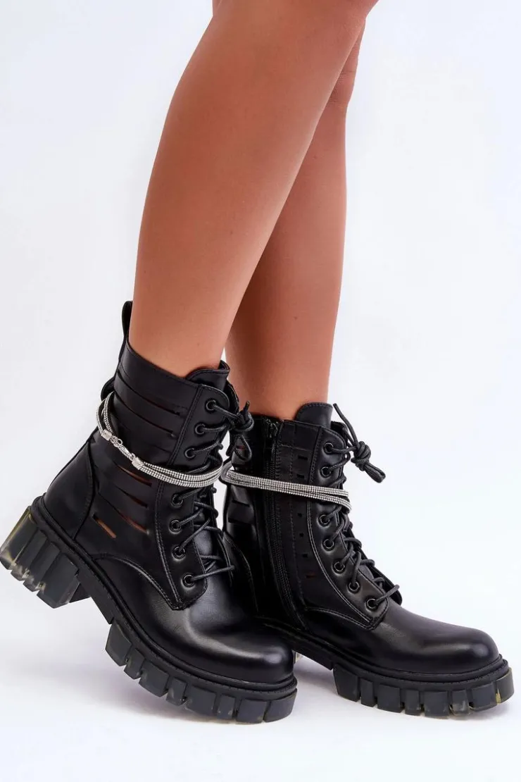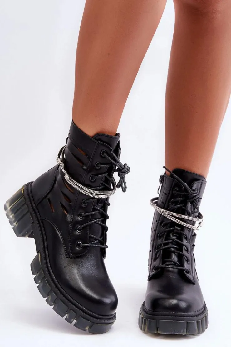 Niezwykłe i stylowe botki wykonane z eko skóry. Zapinane są z boku cholewki na zamek oraz dodatkowo sznurowane. Botki posiadają usztywniany zapiętek. Ozdobny, odpinany paseczek został wzbogacony dżetami imitującymi cyrkonie. Botki zostały wykonane z eko skóry z modnymi przecięciami. Osadzono je na masywnym, płaskim obcasie i platformie. Przy wyborze rozmiaru prosimy sugerować się tabelą rozmiarów.