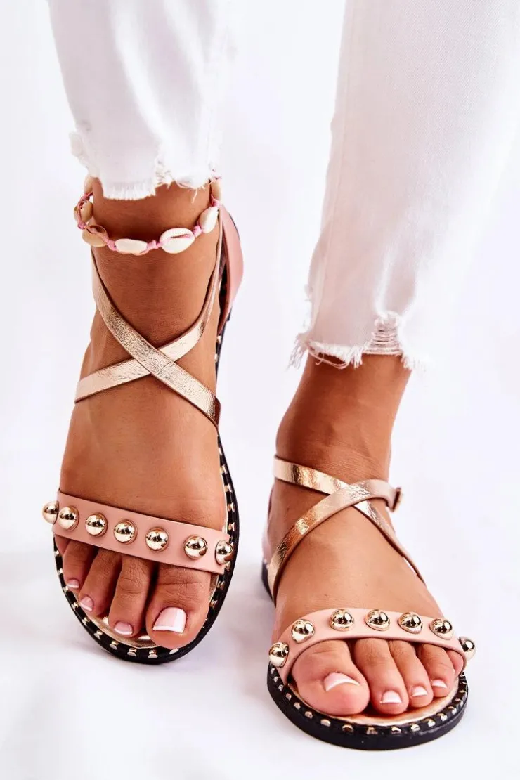 Modne, a zarazem wygodne sandały na płaskim obcasie zostały wykonane z eko skóry. Posiadają dekoracyjne zdobienia wokół podeszwy. Modny fason z przeplatającymi się paskami. Wkładka jest także wykonana z eko skóry z dodatkowym pikowaniem. Model zapinany wokół kostki na regulowany pasek ze sprzączką. Ozdoby w postaci dżetów znajdują się na przednim pasku obuwia. Podeszwa wykonana z gumowego tworzywa, antypoślizgowa. Przy wyborze rozmiaru prosimy kierować się tabelą rozmiarów.